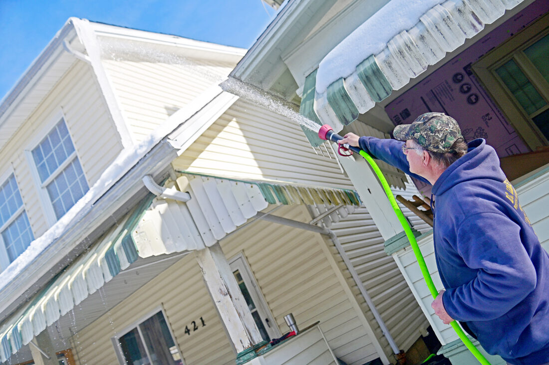 Dave Leberfinger hoses water on a huge icicle on the corner of his Maple Avenue home in Altoona as a safety measure for pedestrians on Tuesday afternoon.