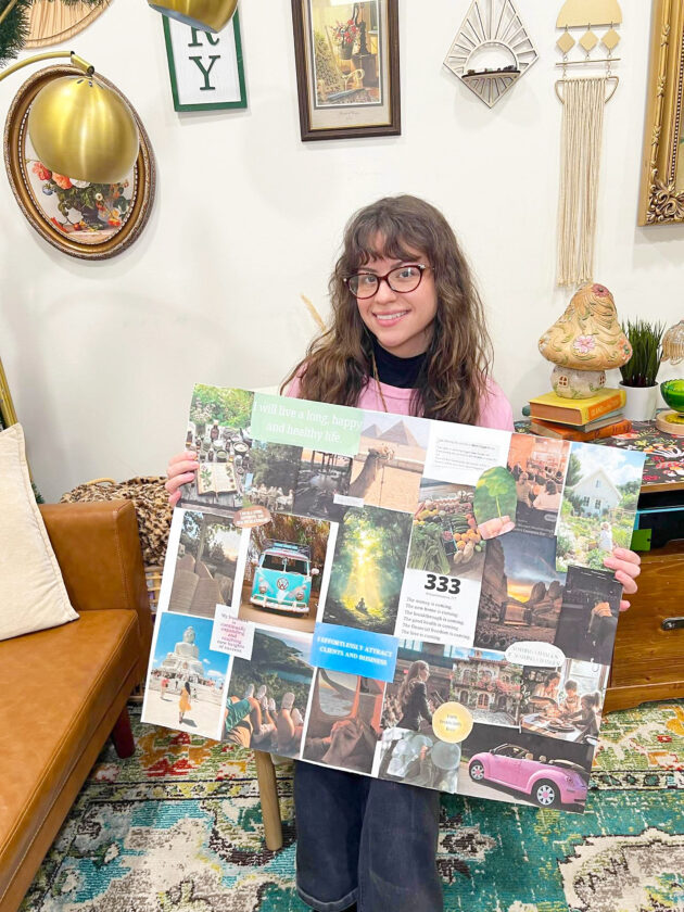 Owner of Skin and Soul Emily Mason holds with her vision board from 2023 filled with future aspirations such as speaking at events or images she resionated with like a four leaf clover and the numbers “333.” Courtesy photo