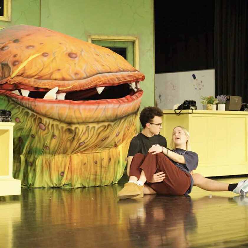 - llin Matthews and Lily Burns (Audrey) rehearse in front of the puppet of Audrey II (Christian Jennings, not shown). Courtesy photo