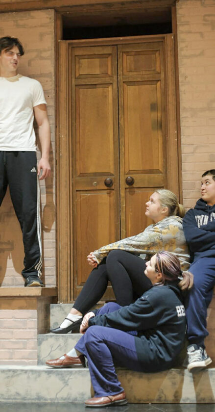 - Alia Bennett, Alyssa Briggs and Jadyn Soboleski (bottom step to top step) look up at Tristin Riva during a rehearsal for Bellwood- Antis music department’s production of “Little Shop of Horrors.” Courtesy photo