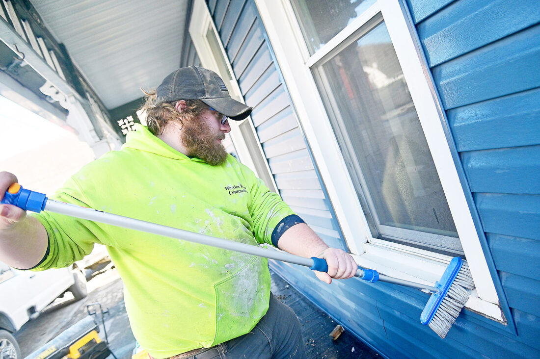 Alan Koch of Warrior Ridge Contracting, Warriors Mark, cleans the frame of a newly installed window along West 14th Street in Tyrone on Thursday afternoon.