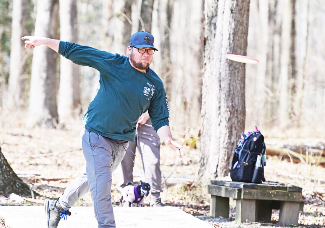 Mirror photo by Patrick Waksmunski / Scott Massar of Altoona tees off on Hole 13 on the Prince Gallitzin State Park disc golf course Sunday afternoon.