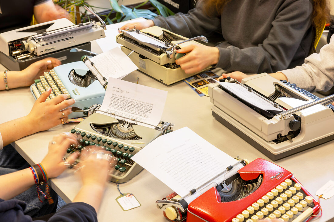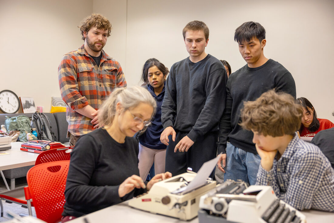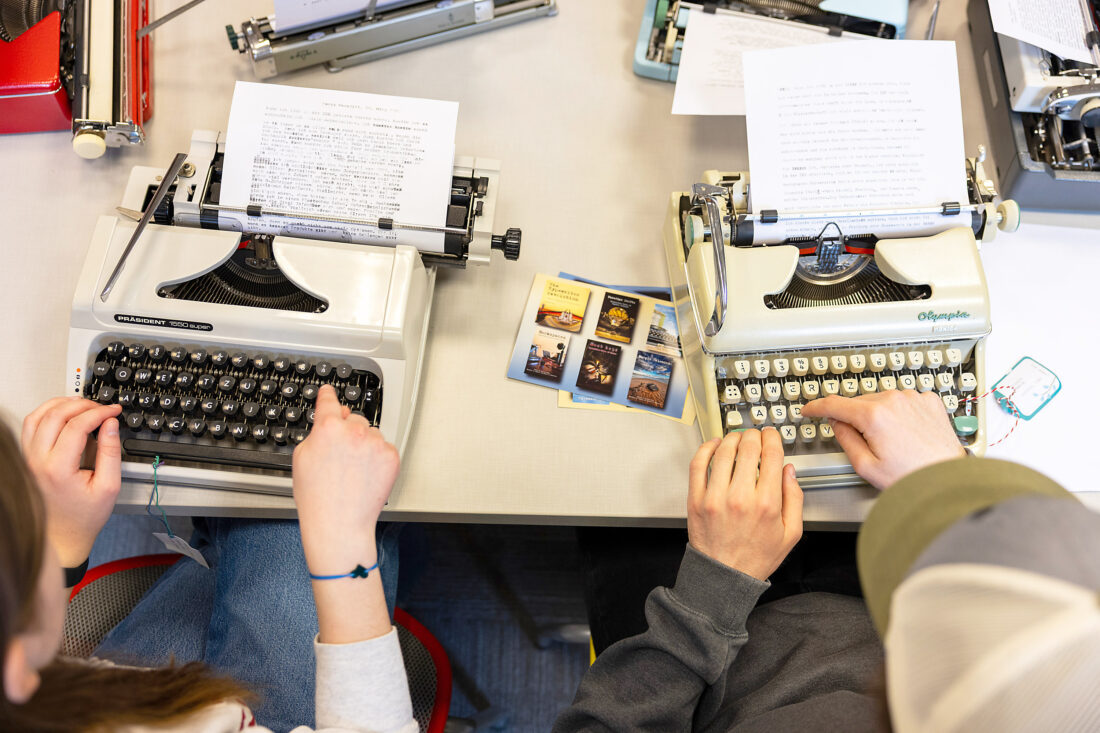 Students arrived for class on a recent analog day to find typewriters at the desks, some with German and some with QWERTY keyboards.