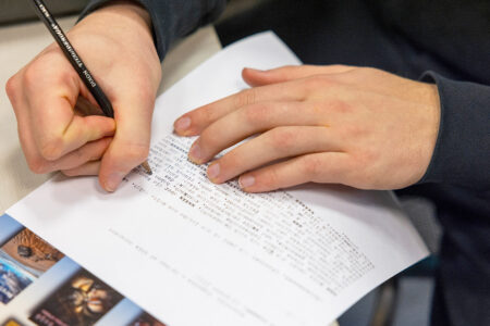 Most students found their pinkies weren’t strong enough to touch-type, so they typed more slowly, pecking at the keyboard with their index fingers. Mong, the freshman, faced the added challenge of a recently broken wrist, requiring her to use just one hand. The self-described perfectionist was initially frustrated with how messy her page looked with odd spacing between certain letters and misspellings. (Phelps told students to backspace and type ‘X’s over errors.)