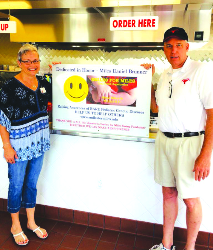 - Penny Brunner, founder of Smiles for Miles, is shown with Buddy Austin of Austin Texas Hot Dogs, Tipton. The location was the largest collector of donations this summer.