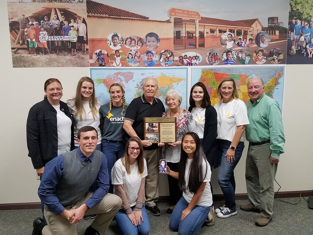 Courtesy photo Gary and Jerri Zimmerman, founders of Love in Action International Ministries, present a plaque to Steve Sheetz (far right) and members of the Enactus team at Penn State Altoona. Steve and Nancy Sheetz gave a generous donation to the Penn State Altoona Enactus Program, and the students voted to give the donation for the construction of a store/cafe project on a property at an orphanage in Bolivia. The students developed a marketing plan for the store while on a trip to the orphanage in March 2018. On the wall behind the group are photos of the orphanage.