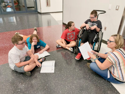 - Malachi Ankeny (from left), Sean Furry, Campbell Fleegle, Landon Boyer and Penguin Project Coordinator Tami Hinish run lines together in rehearsal. Courtesy photo