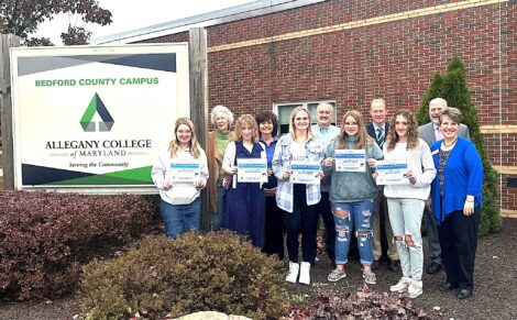 - From left, Gabrielle Bauman, Autumn George, Riley Milburn, Jenna Baker and Reagan Shindle were joined by the college’s PA Advancement and Community Relations Director Leah Pepple (front row). In the back row, Bedford County Regional Education Foundation members Lynn Ashe (secretary), Beth Manges (vice chair) and Kirt Morris (treasurer) were joined by the college’s Advancement and Community Relations Vice President David Jones and Instructional and Student Affairs Senior Vice President Kurt Hoffman.