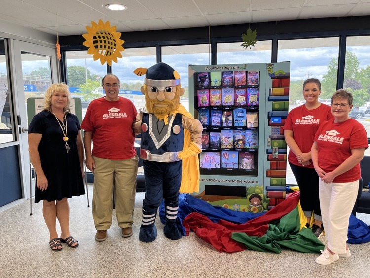 Courtesy photo Shown with a book vending machine awarded to Glendale Elementary School by the Glendale School District Education Foundation are (from left): Jenny Williams (elementary principal), William Morrison (GSDEF executive director), Vinnie the Viking, Kaylee Wagner (GSDEF board member) and Patty Kimberly (GSDEF board member).