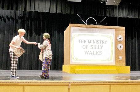 - Greg Wenzel (left) and Toby Garner perform the sketch “The Ministry of Silly Walks” as part of the Altoona Area High School Drama Club’s presentation of “Monty Python’s Edukational Show: School Edition.” Courtesy photo