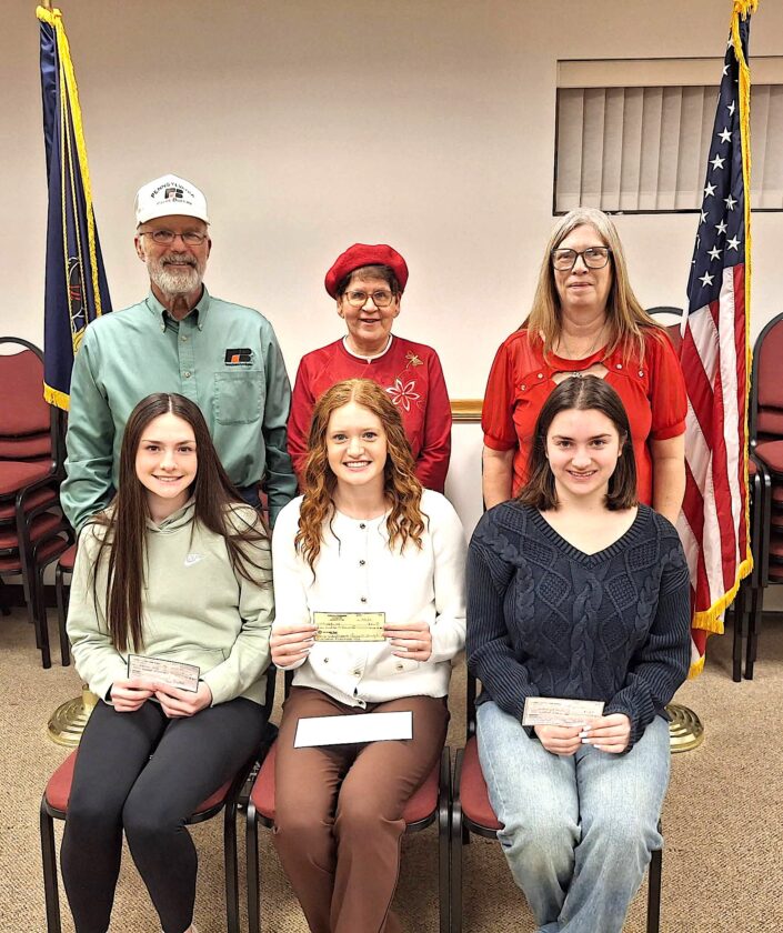 Courtesy photo Taking part in the Cambria County Farm Bureau’s scholarship presentation are (from left): front row — Addison Hite, Madelyn Lieb and Sophie Westrick; back row — Marty Yahner (Cambria County Farm Bureau president), Cecilia Farabaugh (daughter of George Farabaugh) and Diane Westrick (Cambria County Farm Bureau treasurer).