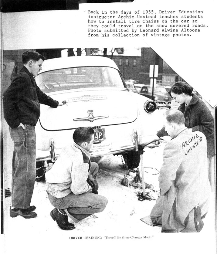 Back in the days of 1955, driver education instructor Archie Umstead teaches students how to install tire chains on a car so they could travel on the snow-covered roads. The photo was submitted by Leonard Alwine of Altoona from his collection of vintage photos.