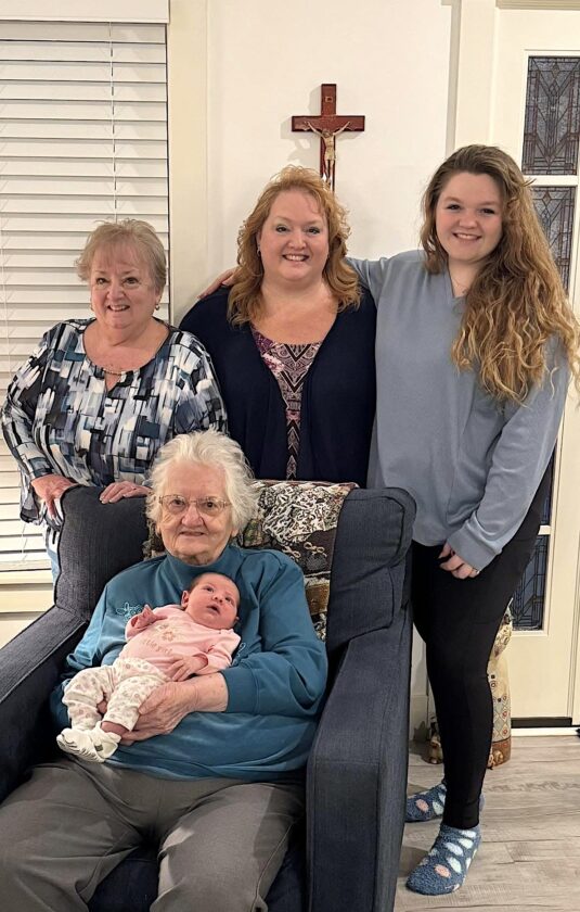 A local family is celebrating five generations of women spanning nearly 100 years. Mary Patricia “Patty” Swope, 96, of Altoona (seated) is shown with her descendants (from left) her daughter, Nancy Smith, 70, granddaughter, Sharon Hoover, 54, great-granddaughter, Sarah Orr, 21. Swope is holding her great-great-granddaughter, Adalyn Grace Orr, who was born Jan. 21, 2026. The latter four reside in the Tyrone area. Courtesy photo