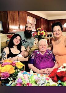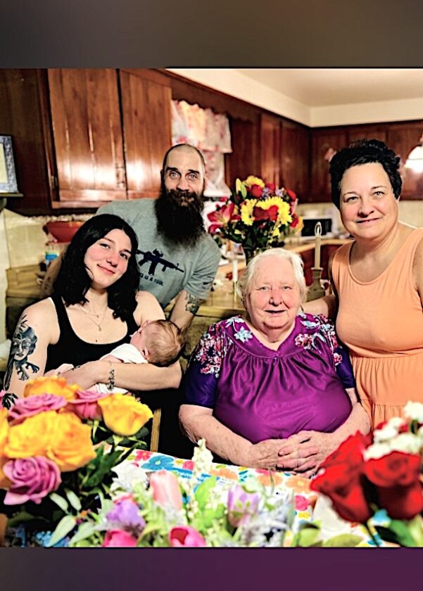Five generations of Freya Wagner’s family include (from left): Nevaeh Brubaker of Altoona, mother, holding Freya Wagner, 4 months old; Justin Brubaker of Cresson, grandfather; Mary Zeak, 92, of Hollidaysburg, great-great-grandmother; and Donna Zeak of Altoona, great-grandmother.