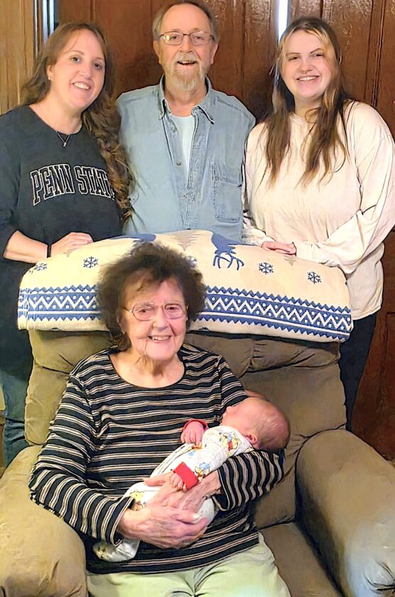 The Altoona Mirror accepts photos of families who recently added a fourth or fifth generation. Photos will be published at no charge on the Community News page. The photo may include one representative of each generation and should include identifications for everyone in the photo. It should include the person’s name, town and how they are related to the baby in the photo. Photos should be submitted within six months of the new addition and can be emailed to community