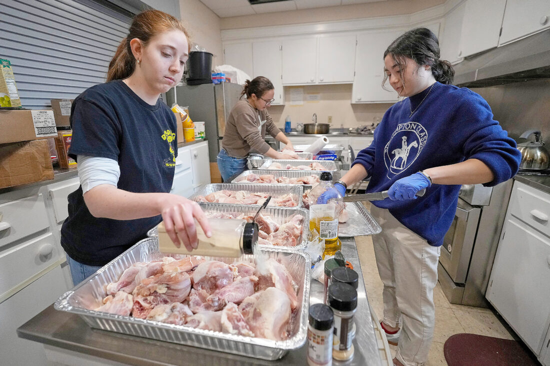Colby College students Hannah Rothenberg (left), Ava Shapiro (right) and Becca Hoffman prepare chicken on March 30 for a passover meal at the Beth Israel Synagogue in Waterville, Maine. The Associated Press
