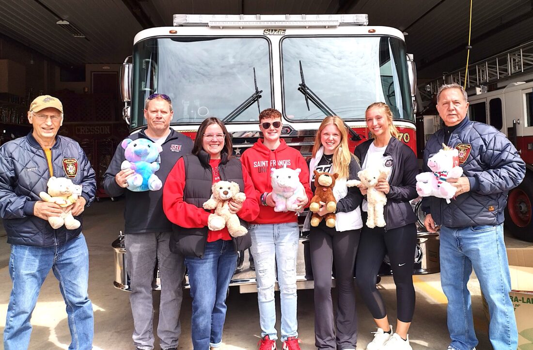 The Keystone Regional Fire Rescue Department recently accepted teddy bears at the Cresson Station from the Saint Francis University Criminal Justice Club and Mark Buckwalter of the Saint Francis University Criminal Justice Department. Shown are (from left): Eric Hott from the KRFRD; Mark Buckwalter, Saint Francis University Criminal Justice Department; Adelyn Dull, Melissa Malackany, Hannah Kantola and Cate Moyer, members of the Saint Francis University Criminal Justice Club; and Jim Grodes from the KRFRD. The teddy bears will be carried on the emergency apparatus to be given to children during difficult or traumatic incidents to provide comfort, reduce anxiety and help take a child’s mind off a stressful situation.