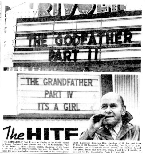 Playing at the Rivoli Theater on Logan Boulevard, Altoona, was the movie “The Godfather-Part II” starring Al Pacino, but it was “The Grandfater Part IV for Robert L. Hite, chairman of the board of the Hite Co., an electric supply firm near the Rivoli. Hite chose this novel method to ...