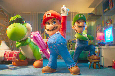 This image released by Universal Pictures shows Yoshi, voiced by Donald Glover, left, Mario, voiced by Chris Pratt, center, and Luigi, voiced by Charlie Day, in a scene from "The Super Mario Galaxy Movie." (Nintendo and Illumination/Universal Pictures via AP)