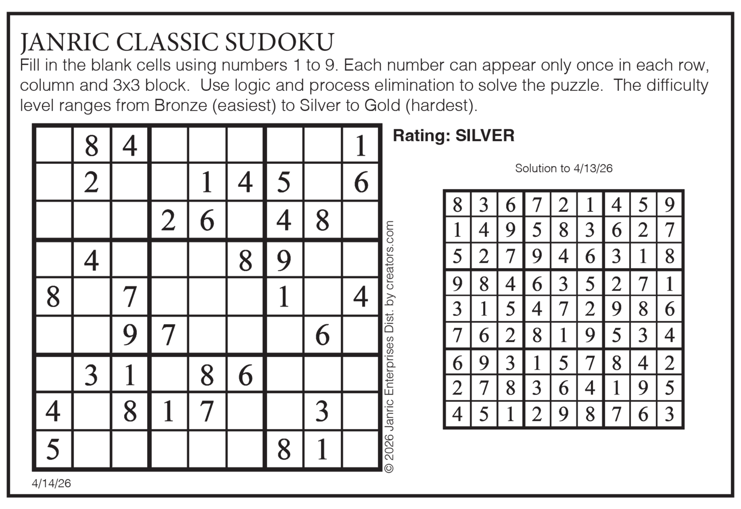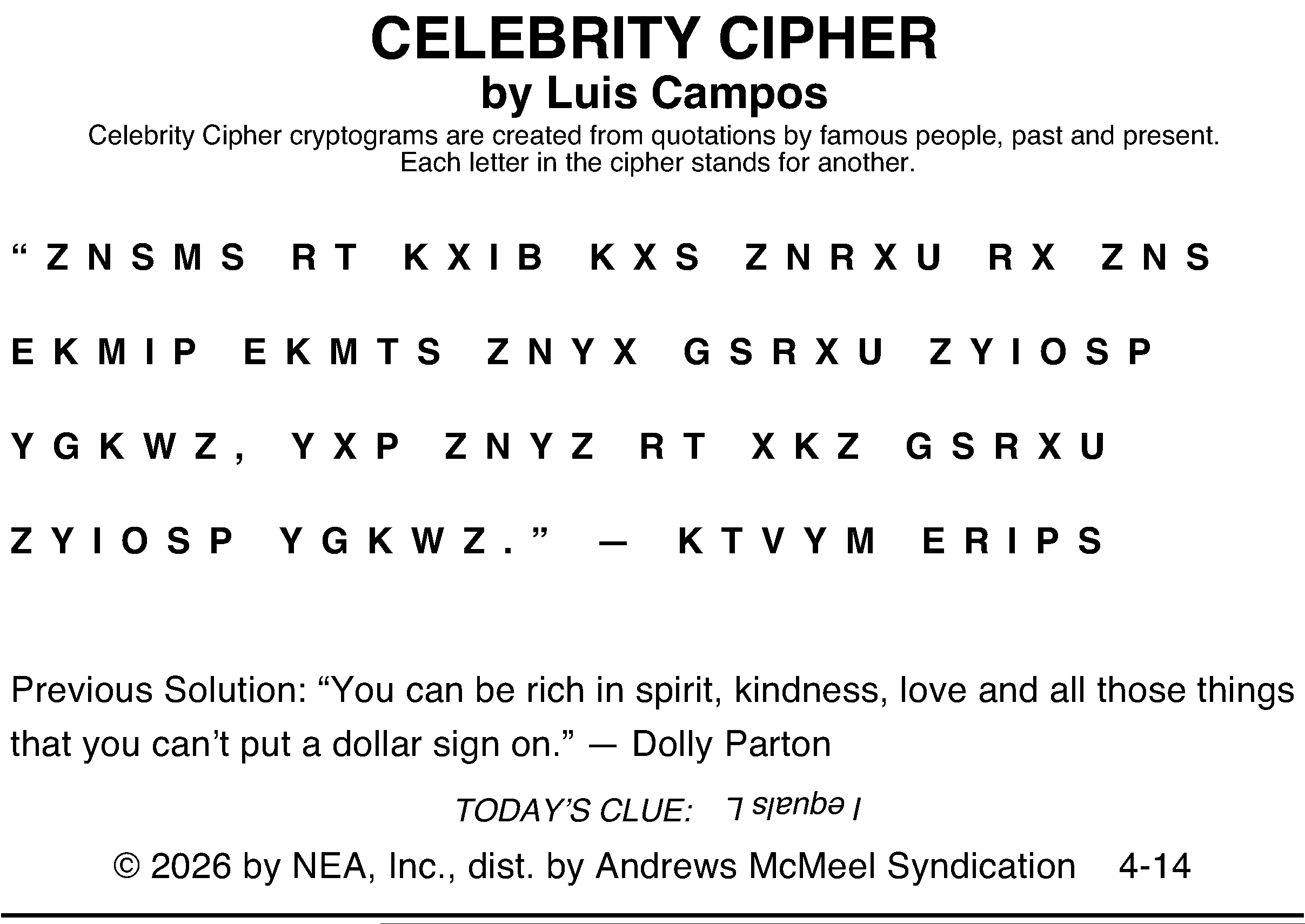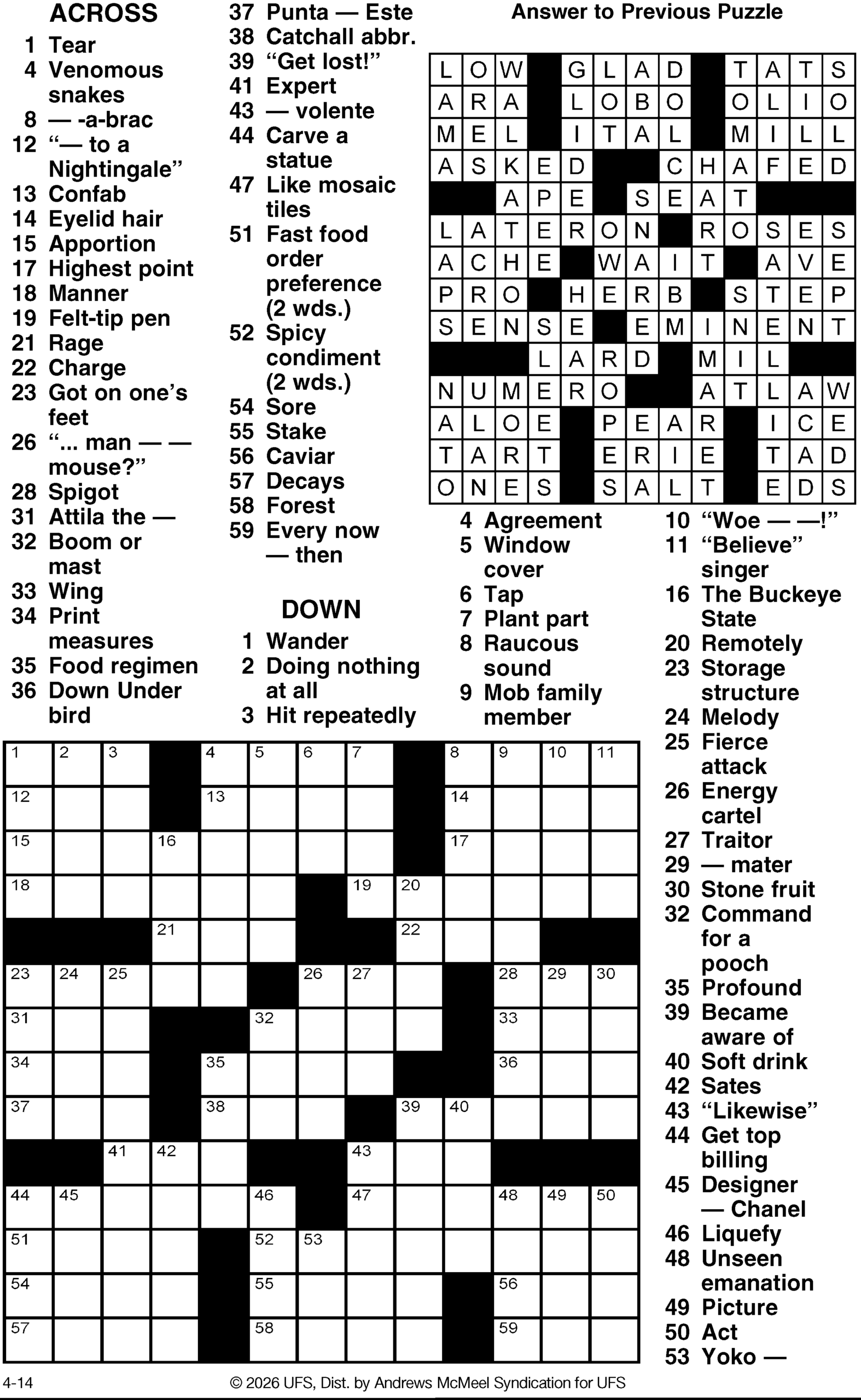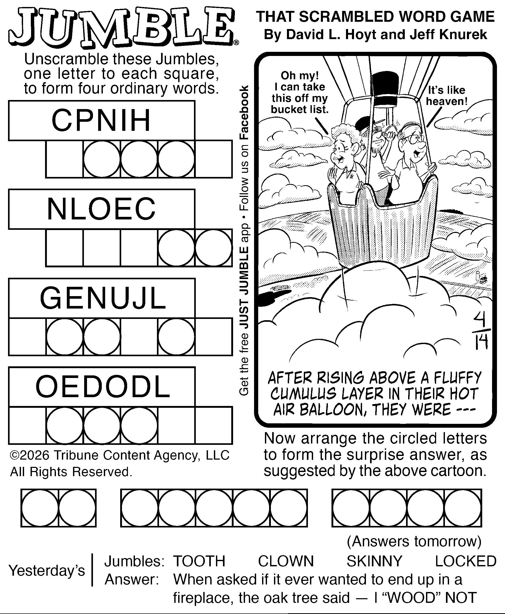 Today’s puzzles: April 14, 2026 Click the corresponding link below to see and print your favorite puzzles Metro Andrews McMeel Crossword Find the words Celebrity Cipher Sudoku Jumble Jumble Crossword Hocus Focus NewsletterToday's breaking news and more in your inboxEmail(Required) I'm interested in (please check all that apply)(Required) Daily Newsletter Breaking News Obituaries Are you a paying subscriber to the newspaper?(Required) Yes No Area Life Today’s puzzles: April 14, 2026 Team response Today’s puzzles: April 13, 2026 Spread your wings Horoscope — Sunday, April 12 A series of trades gets you a long-held wish. Dear ones expand your horizons. You’re there to support, and then ... ‘The Super Mario Galaxy Movie’ falls short in spots, shines in others and still full of fun times