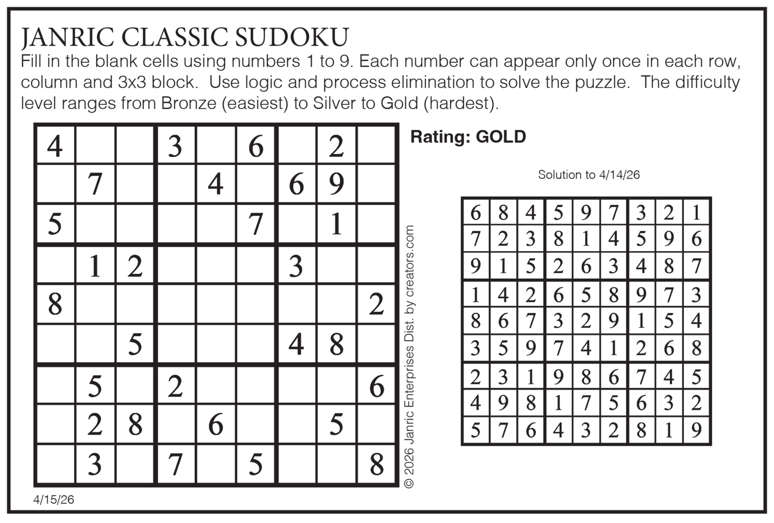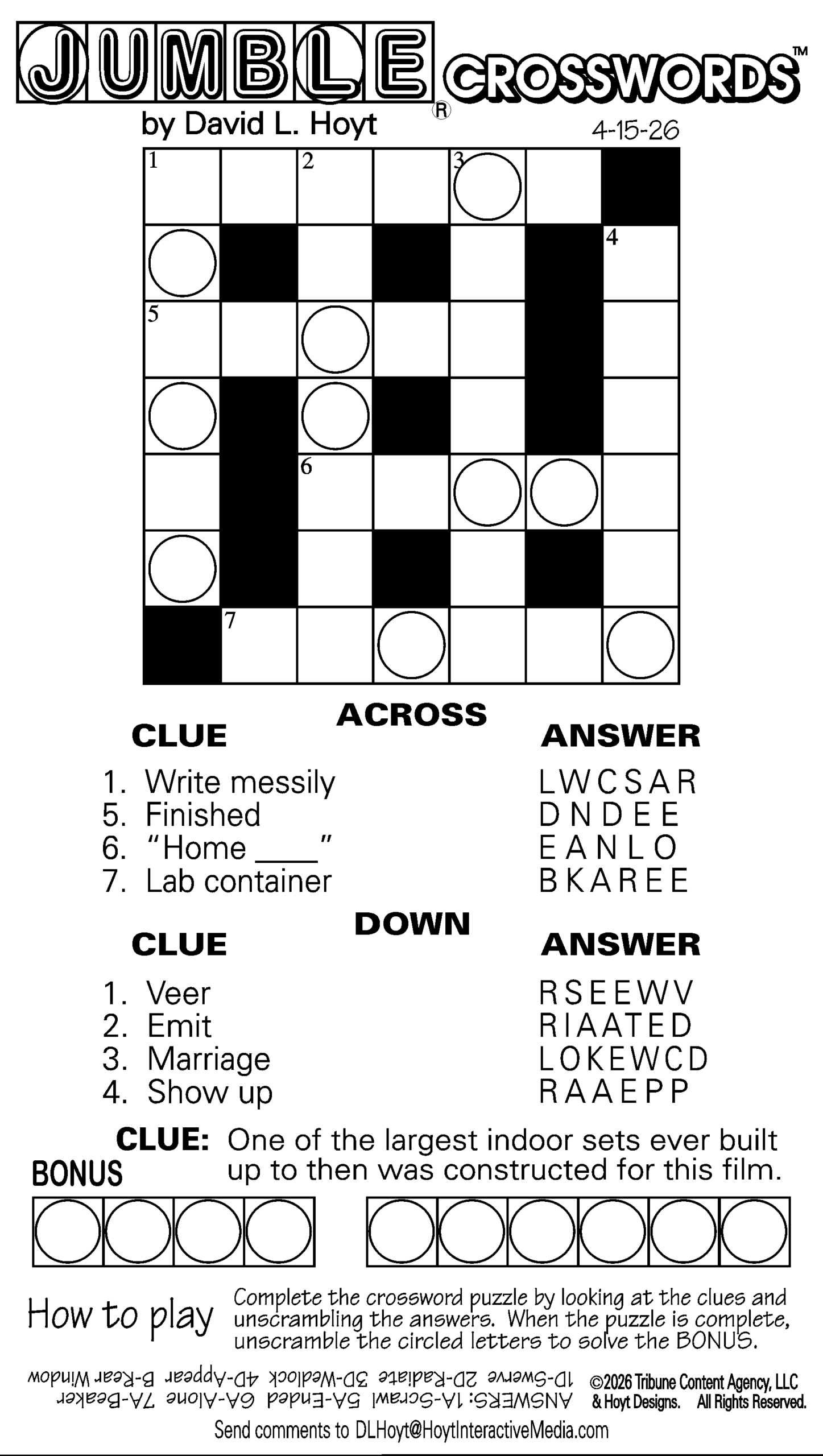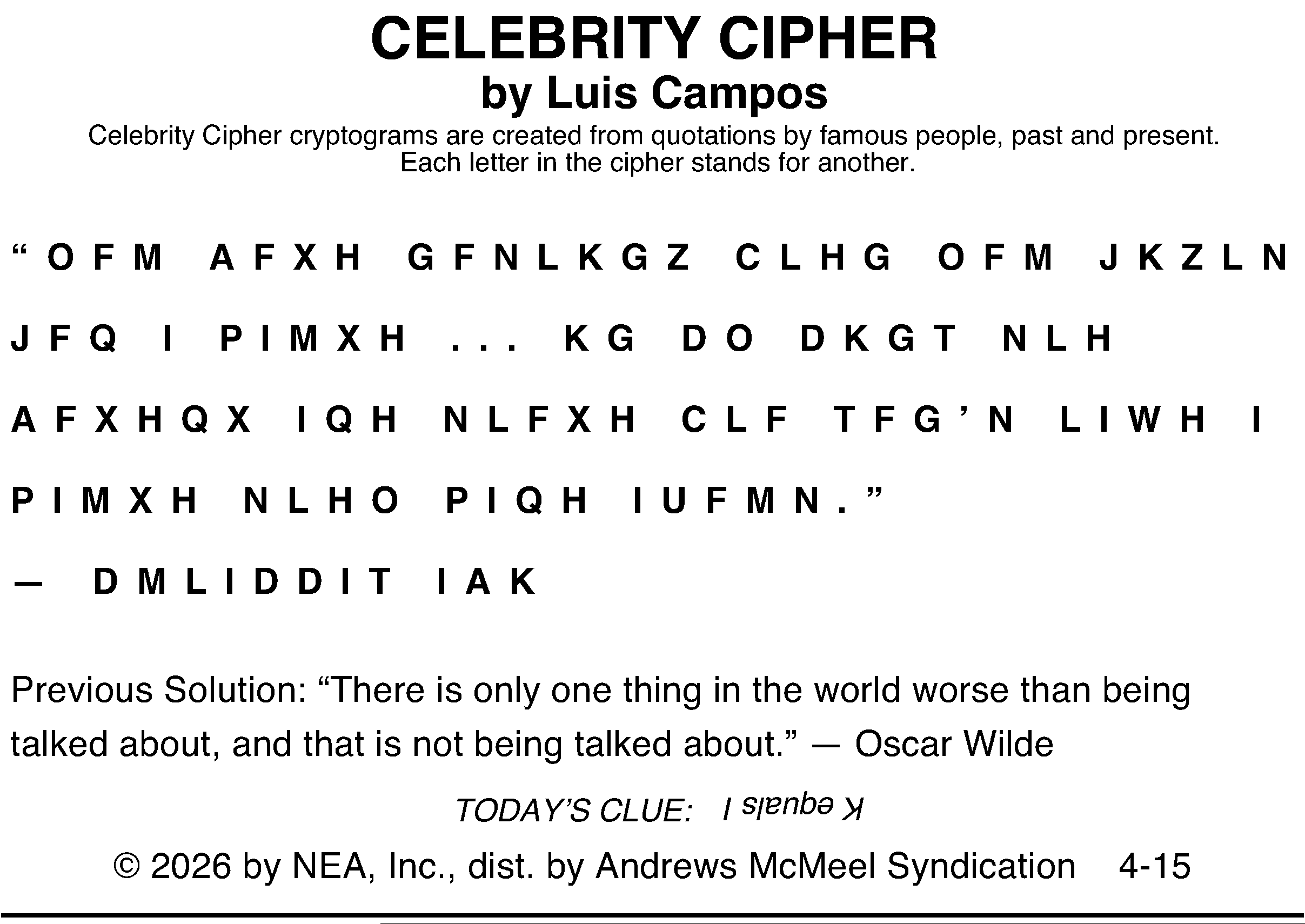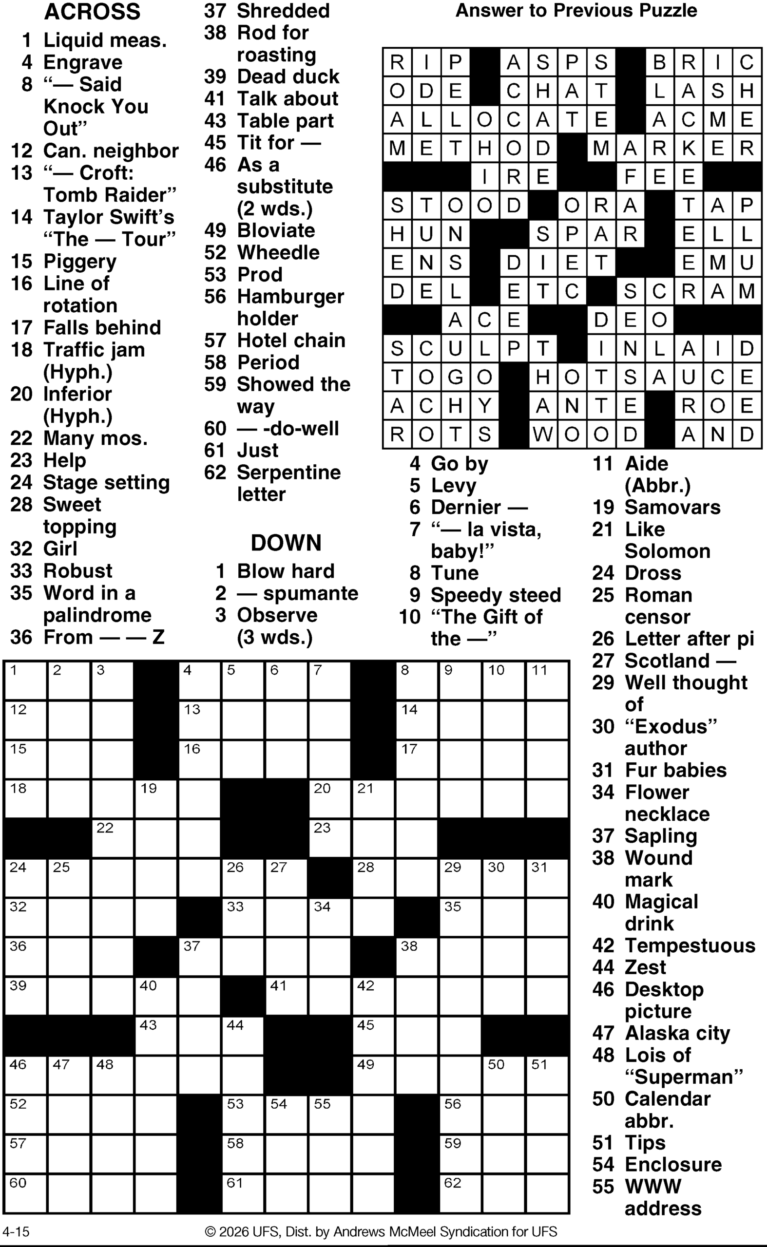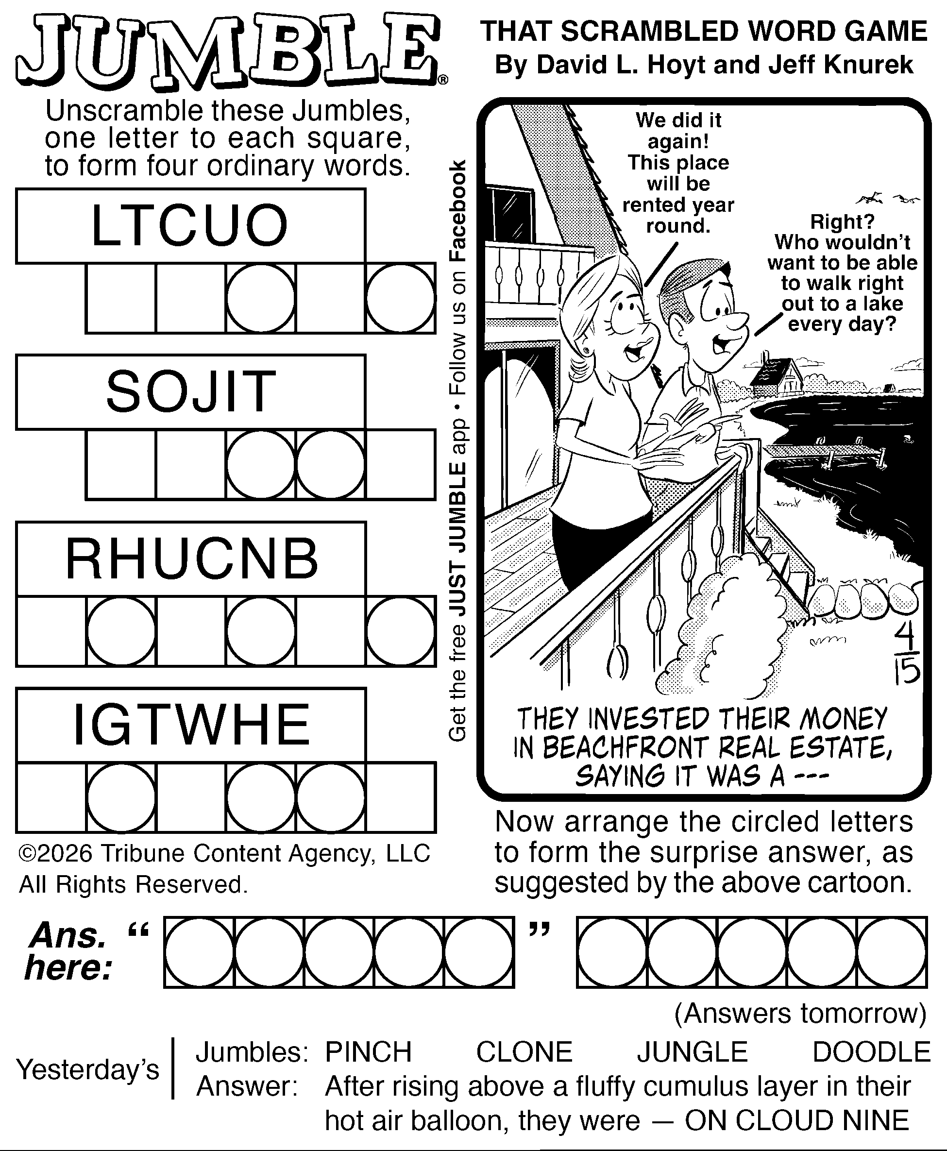 Today’s puzzles: April 15, 2026 Click the corresponding link below to see and print your favorite puzzles Metro Andrews McMeel Crossword Find the words Celebrity Cipher Sudoku Jumble Jumble Crossword Hocus Focus NewsletterToday's breaking news and more in your inboxEmail(Required) I'm interested in (please check all that apply)(Required) Daily Newsletter Breaking News Obituaries Are you a paying subscriber to the newspaper?(Required) Yes No Area Life Today’s puzzles: April 15, 2026 Tidying up Today’s puzzles: April 14, 2026 Team response Today’s puzzles: April 13, 2026 Spread your wings