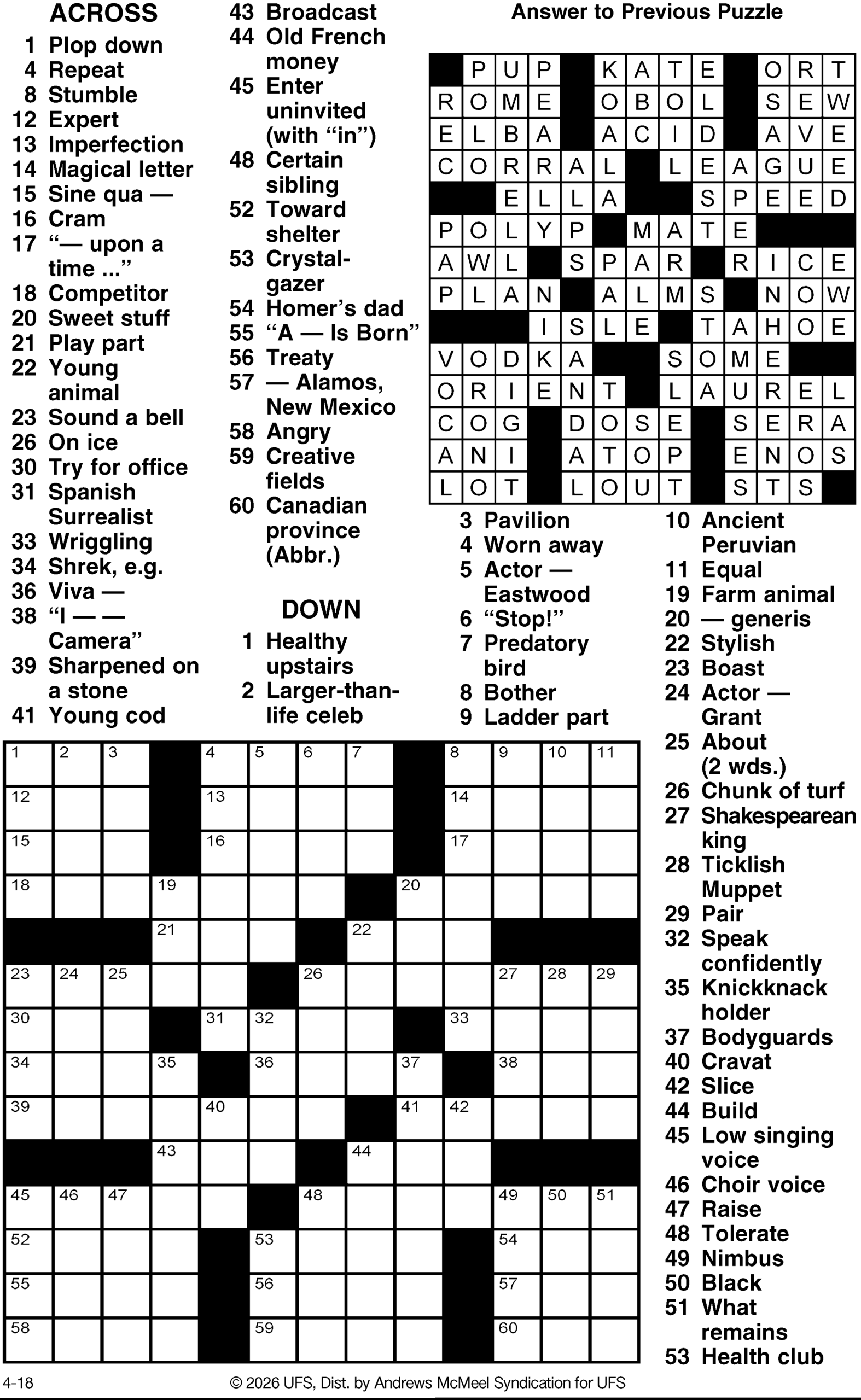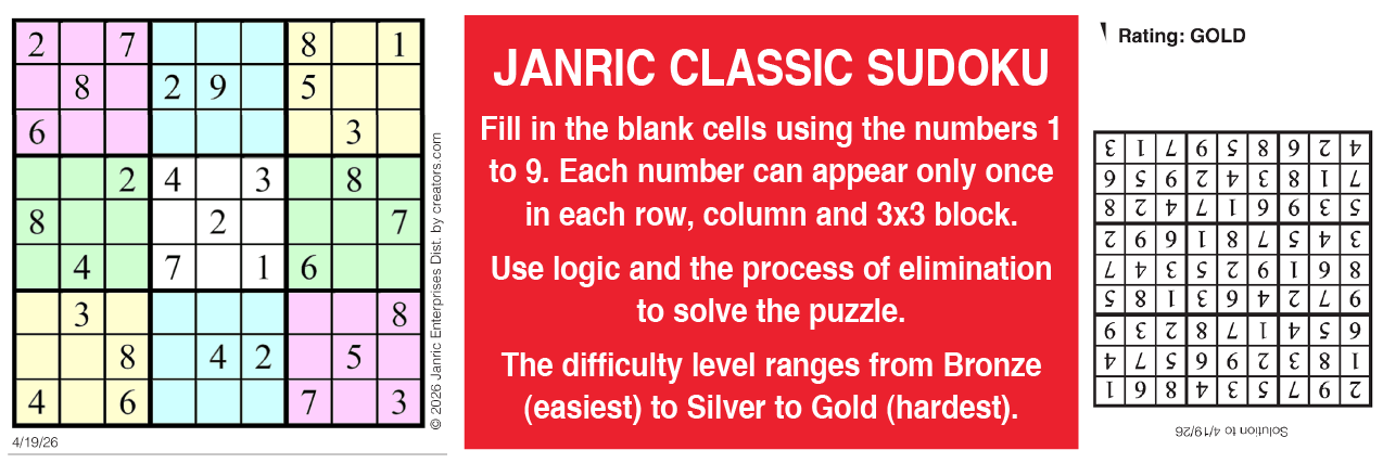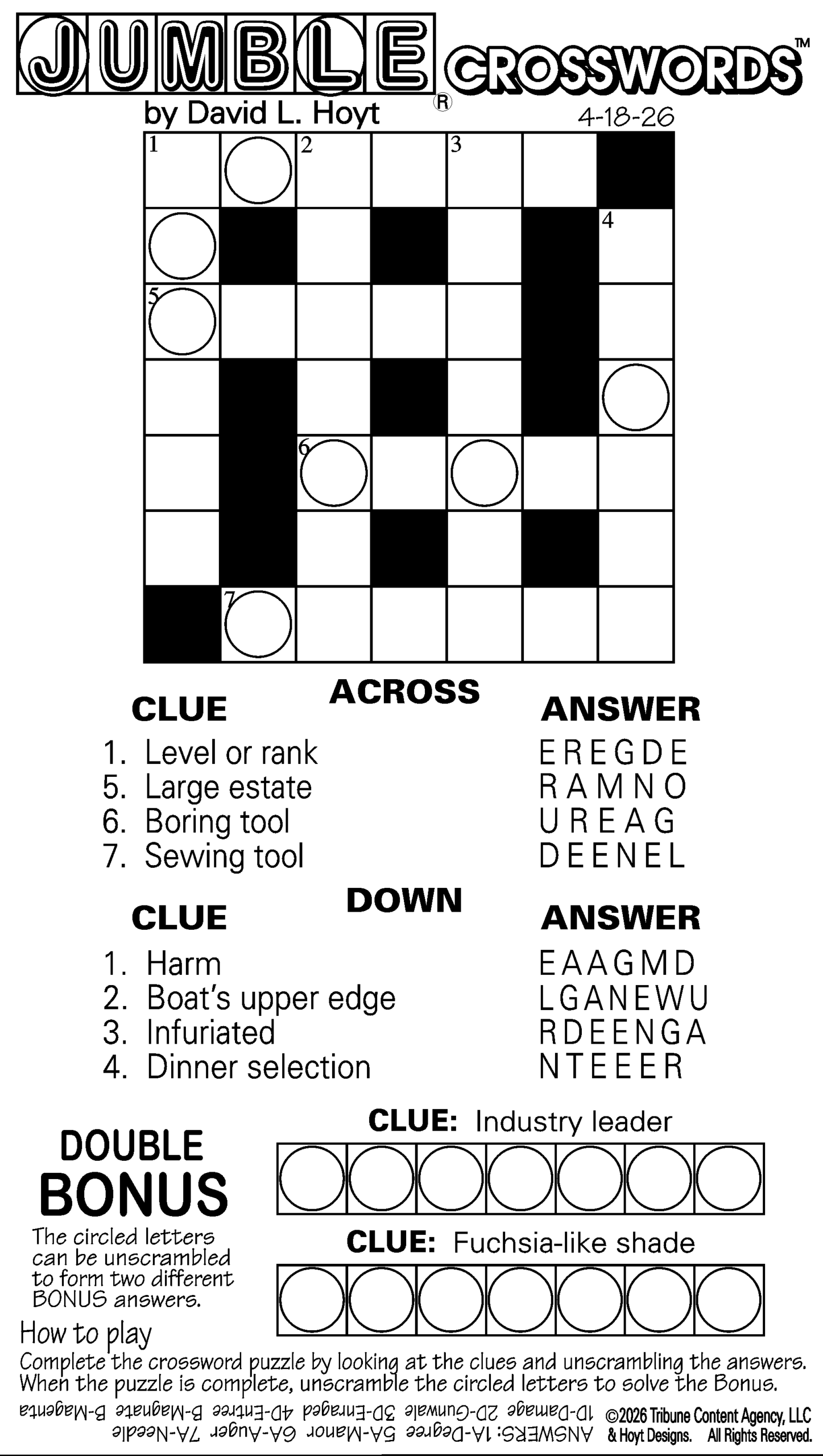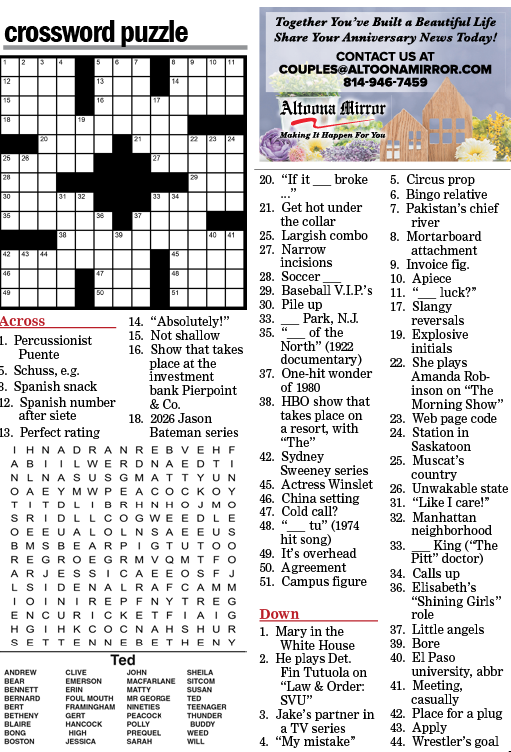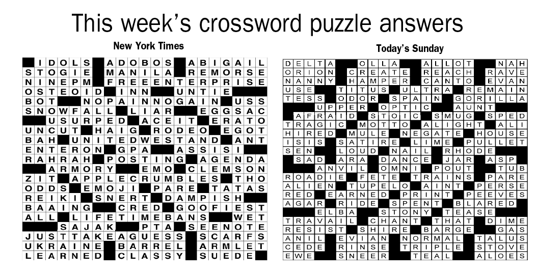 This weekend’s puzzles: April 18-19, 2026 Click the corresponding link below to see and print your favorite puzzles Metro Andrews McMeel Crossword Find the words Celebrity Cipher Sudoku (Saturday) Jumble Jumble Crossword (Saturday) Hocus Focus GO+TV Magazine Crossword Dot-to-dot Sunday Sudoku Jumble Crossword (Sunday) NYT Sunday Crossword Today’s Sunday Crossword NYT & Today’s Sunday Answers NewsletterToday's breaking news and more in your inboxEmail(Required) I'm interested in (please check all that apply)(Required) Daily Newsletter Breaking News Obituaries Are you a paying subscriber to the newspaper?(Required) Yes No Area Life This weekend’s puzzles: April 18-19, 2026 GO+TV planner — April 18-19 At the movies — April 18-19 Residents mark International Women’s Day End of an era The last of the of standing buildings at the former Appvion paper mill in Roaring Spring have been razed this ... Pausing Screen Time: A small but growing movement wants you to put down your phone