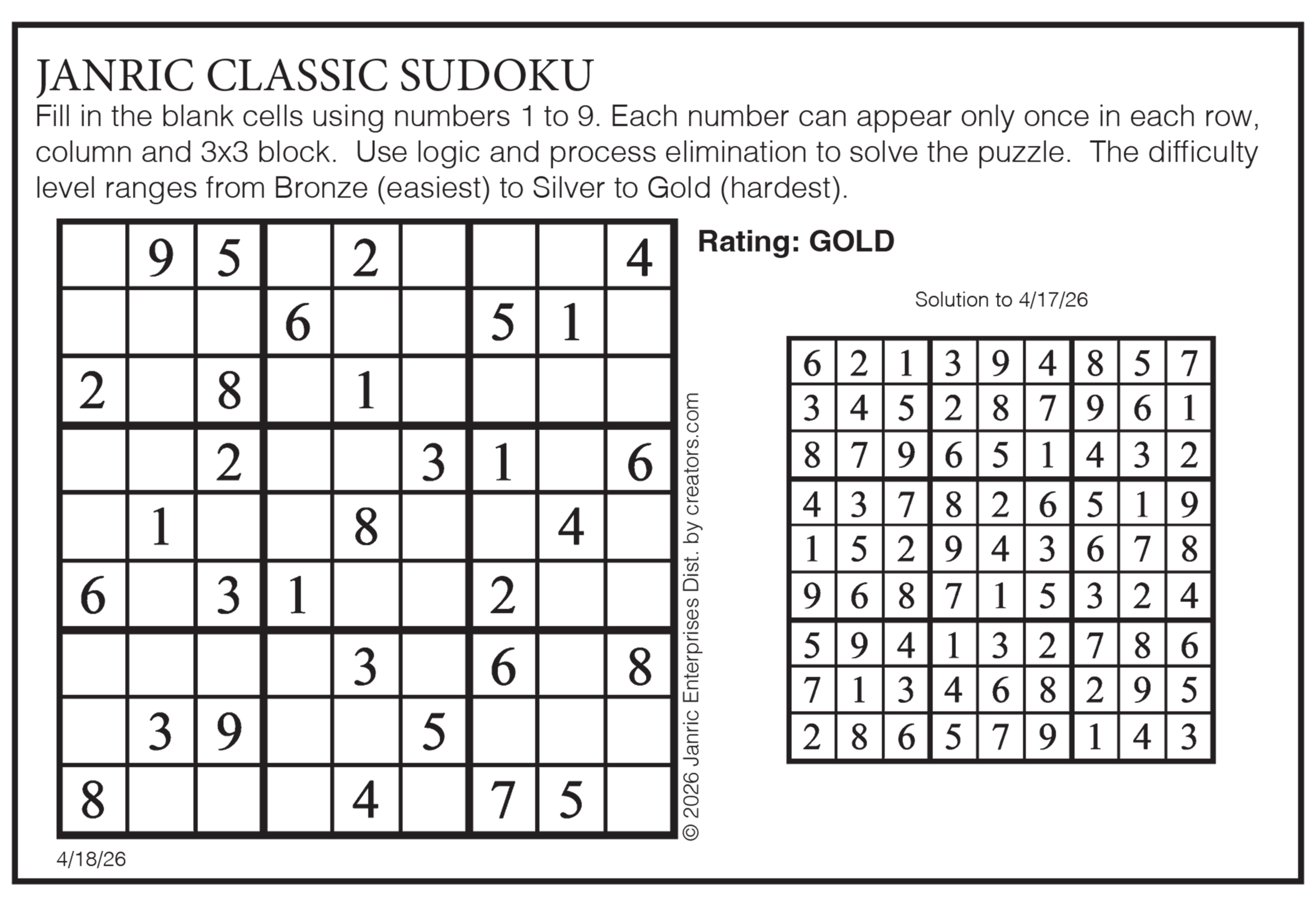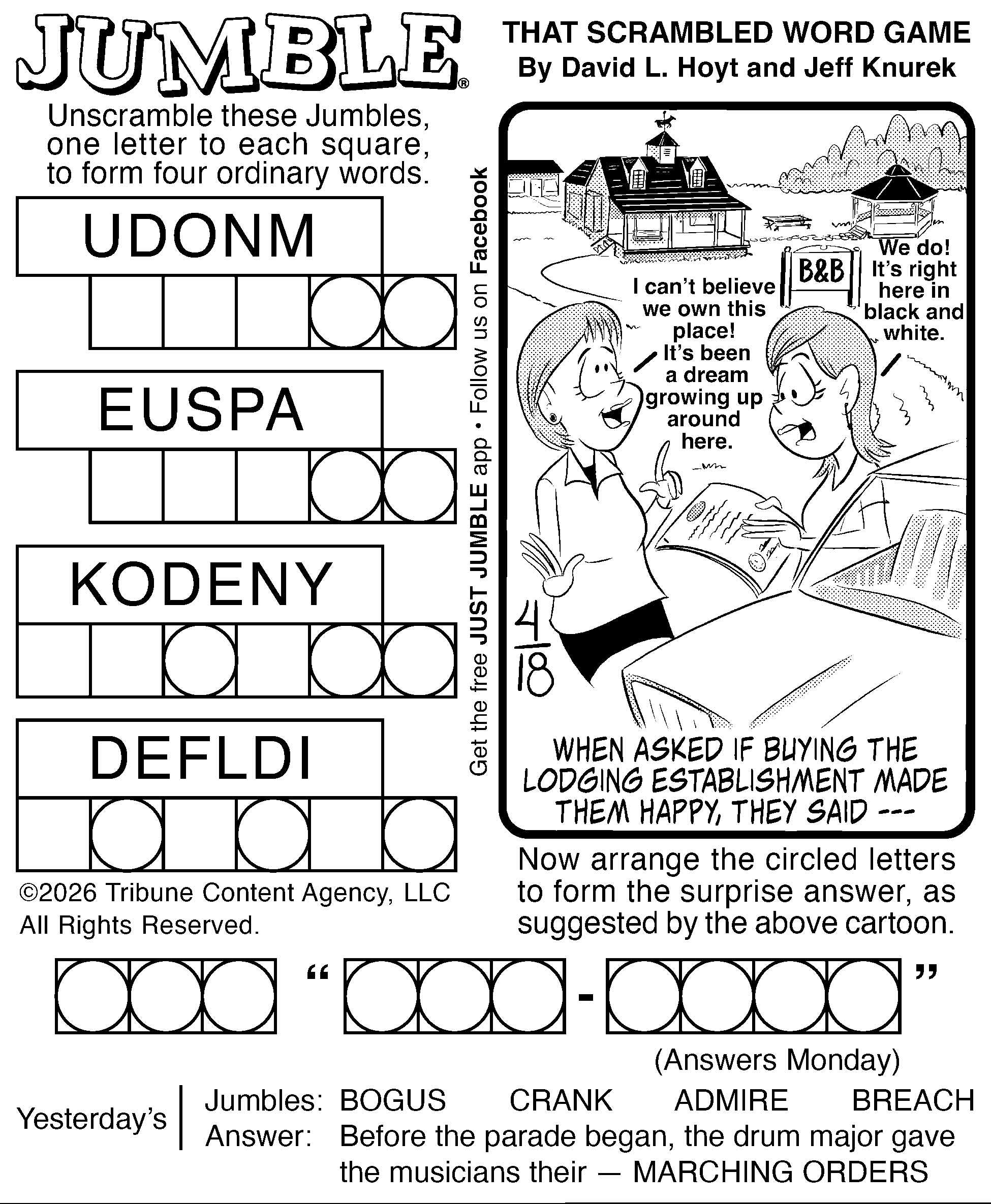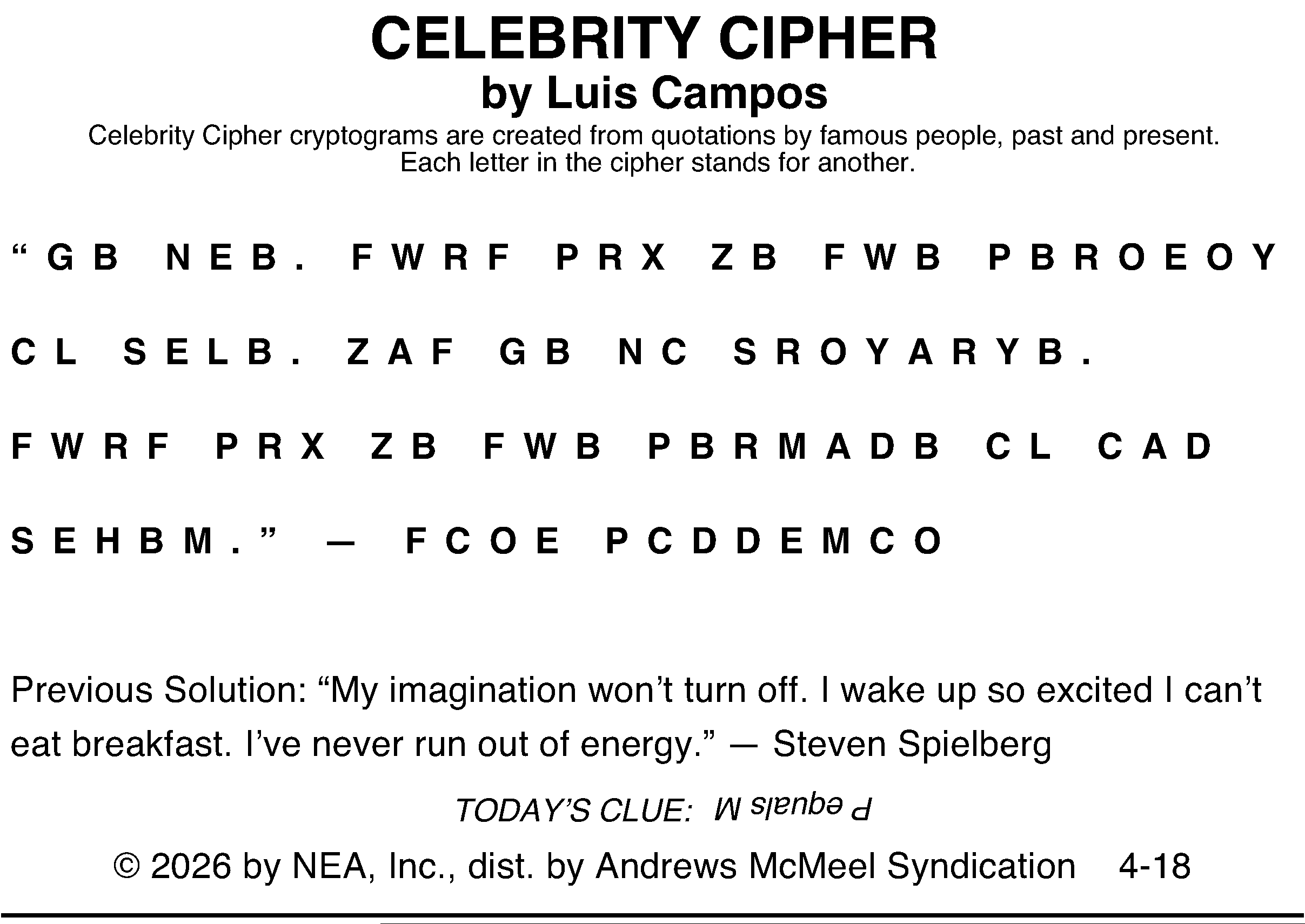 This weekend’s puzzles: April 18-19, 2026 Click the corresponding link below to see and print your favorite puzzles Metro Andrews McMeel Crossword Find the words Celebrity Cipher Sudoku (Saturday) Jumble Jumble Crossword (Saturday) Hocus Focus GO+TV Magazine Crossword Dot-to-dot Sunday Sudoku Jumble Crossword (Sunday) NYT Sunday Crossword Today’s Sunday Crossword NYT & Today’s Sunday Answers NewsletterToday's breaking news and more in your inboxEmail(Required) I'm interested in (please check all that apply)(Required) Daily Newsletter Breaking News Obituaries Are you a paying subscriber to the newspaper?(Required) Yes No Area Life This weekend’s puzzles: April 18-19, 2026 GO+TV planner — April 18-19 At the movies — April 18-19 Residents mark International Women’s Day End of an era The last of the of standing buildings at the former Appvion paper mill in Roaring Spring have been razed this ... Pausing Screen Time: A small but growing movement wants you to put down your phone