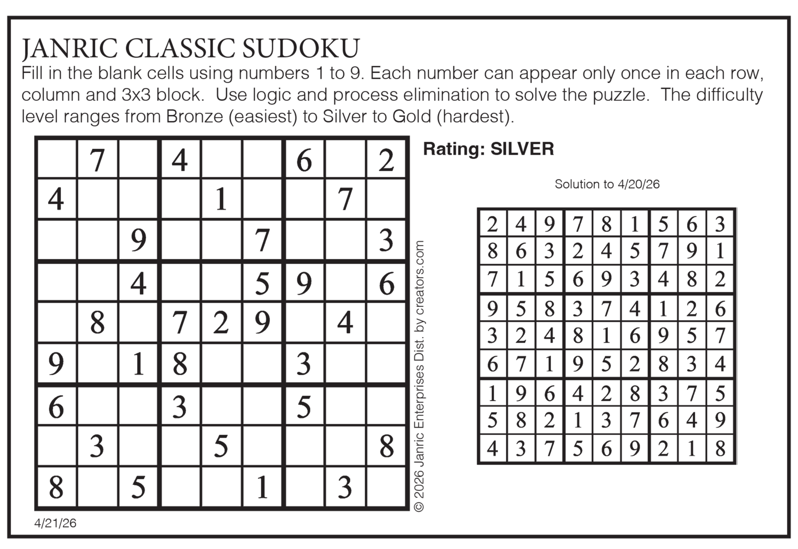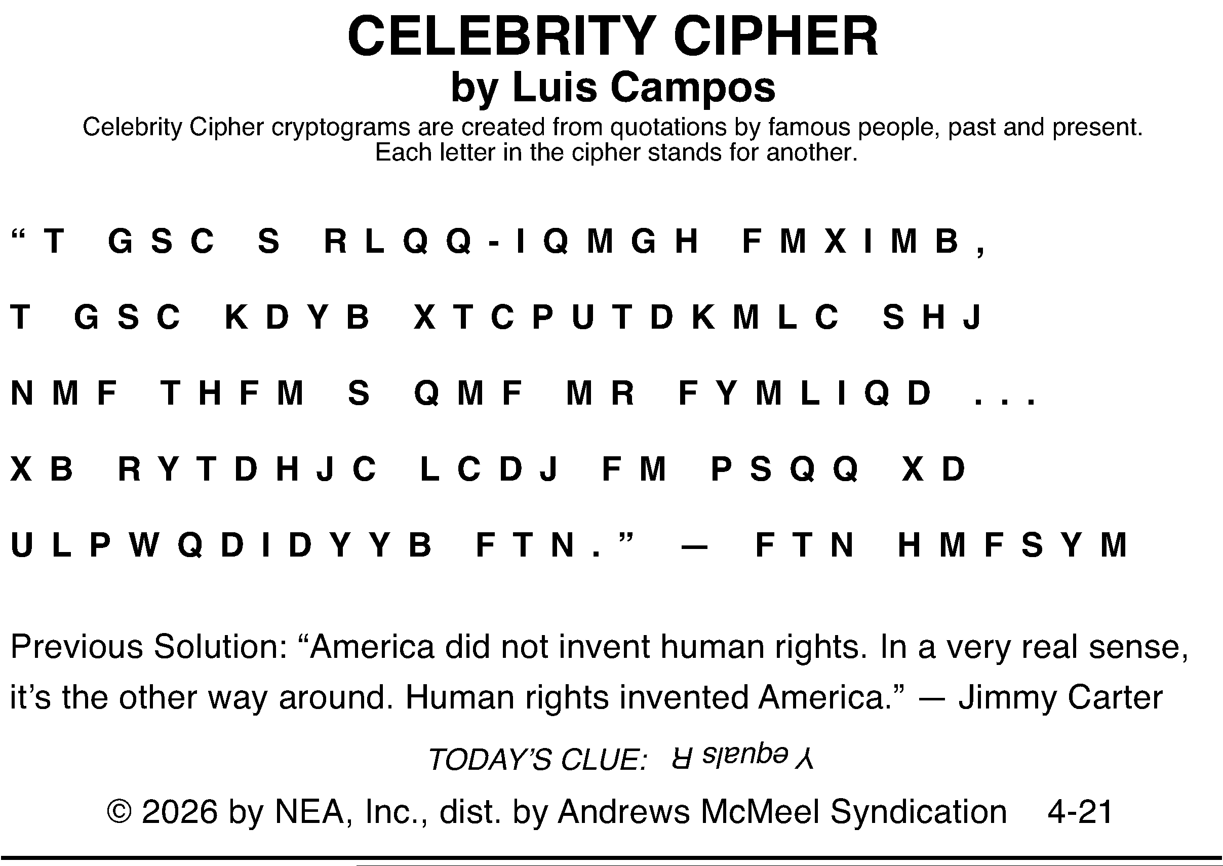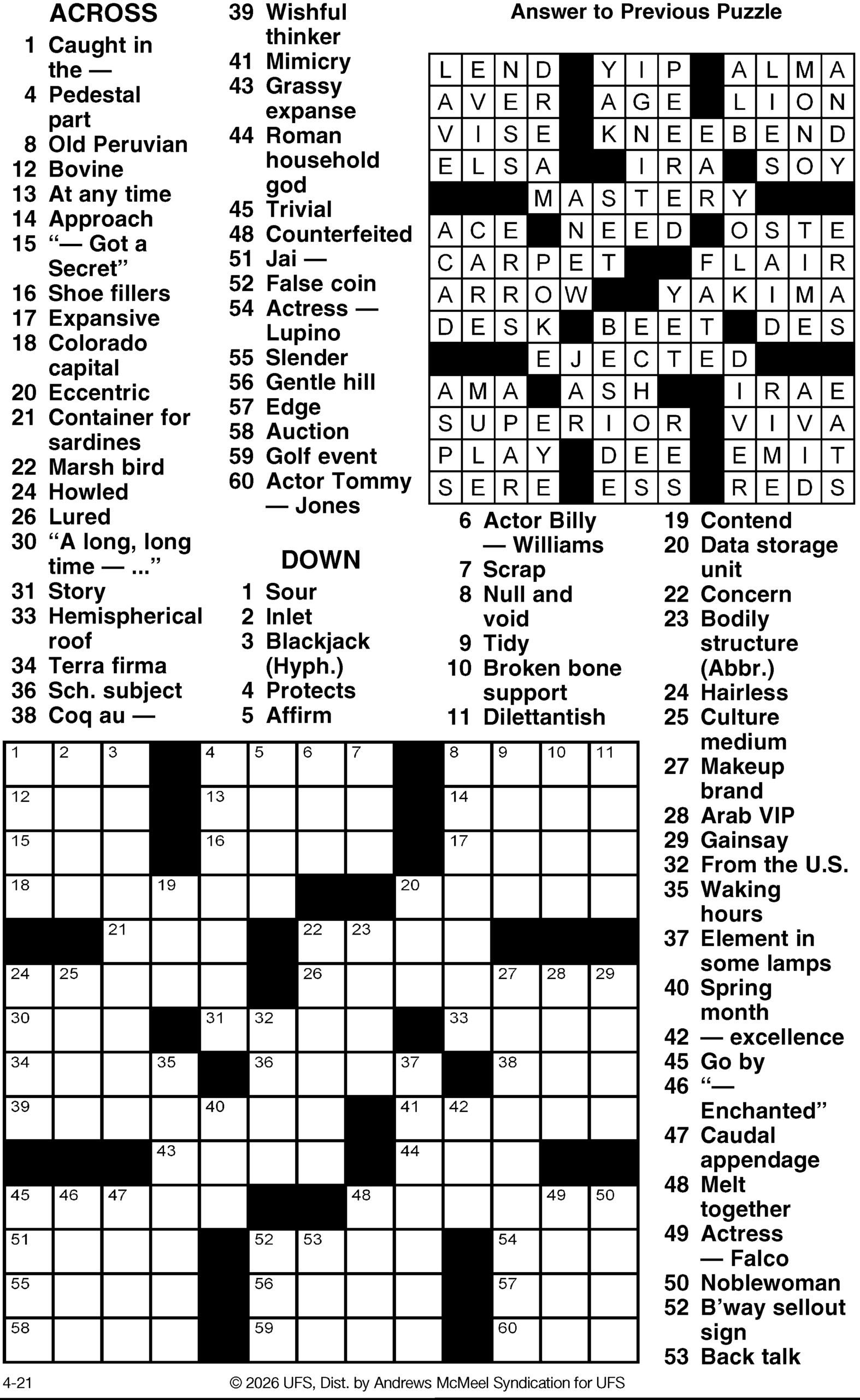 Today’s puzzles: April 21, 2026 Click the corresponding link below to see and print your favorite puzzles Metro Andrews McMeel Crossword Find the words Celebrity Cipher Sudoku Jumble Jumble Crossword Hocus Focus NewsletterToday's breaking news and more in your inboxEmail(Required) I'm interested in (please check all that apply)(Required) Daily Newsletter Breaking News Obituaries Are you a paying subscriber to the newspaper?(Required) Yes No Area Life Today’s puzzles: April 21, 2026 Lionel Liberty Today’s puzzles: Monday, April 20 On the edge Pets of the Week April 19, 2026 Mirror Images April 19, 2026