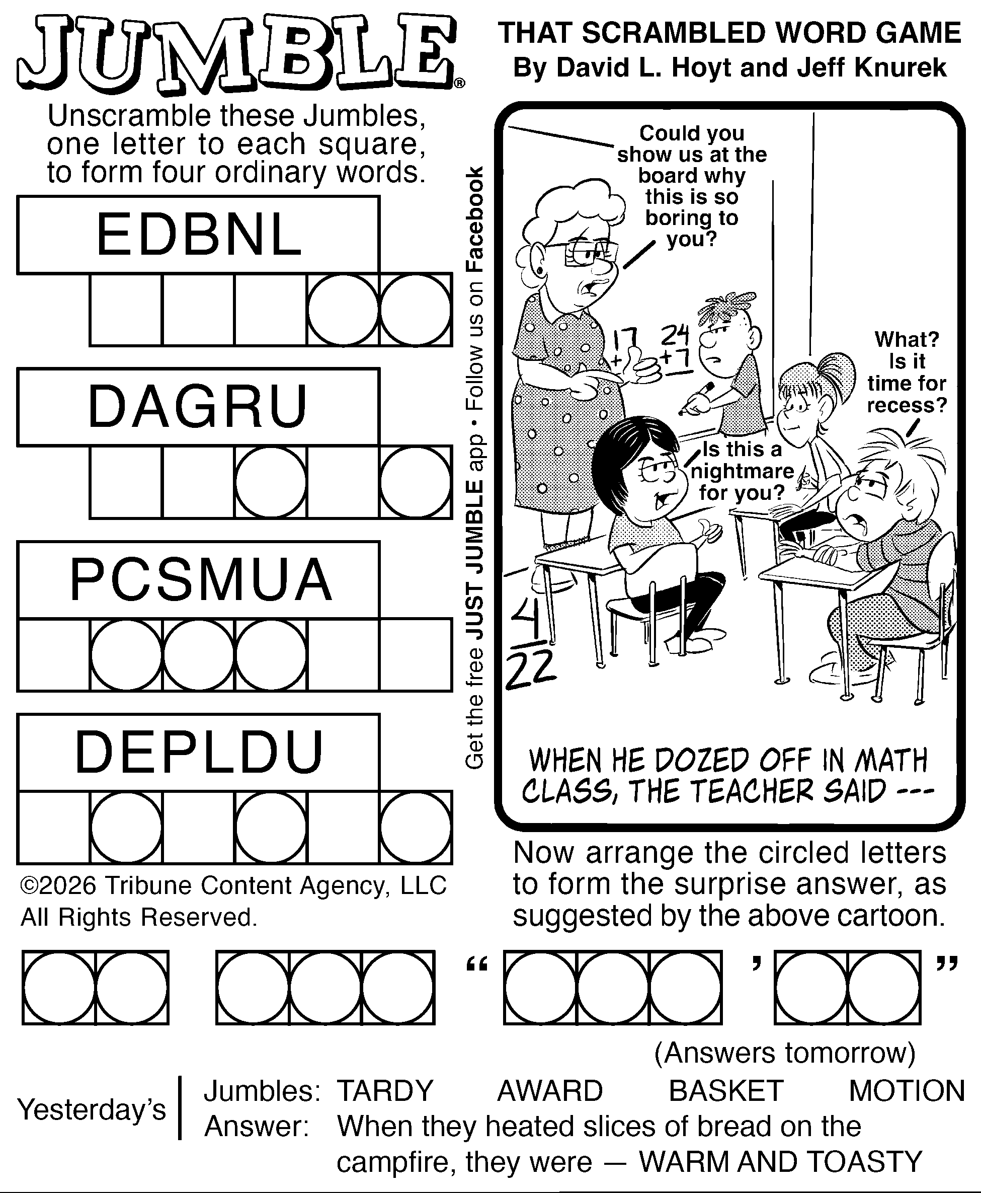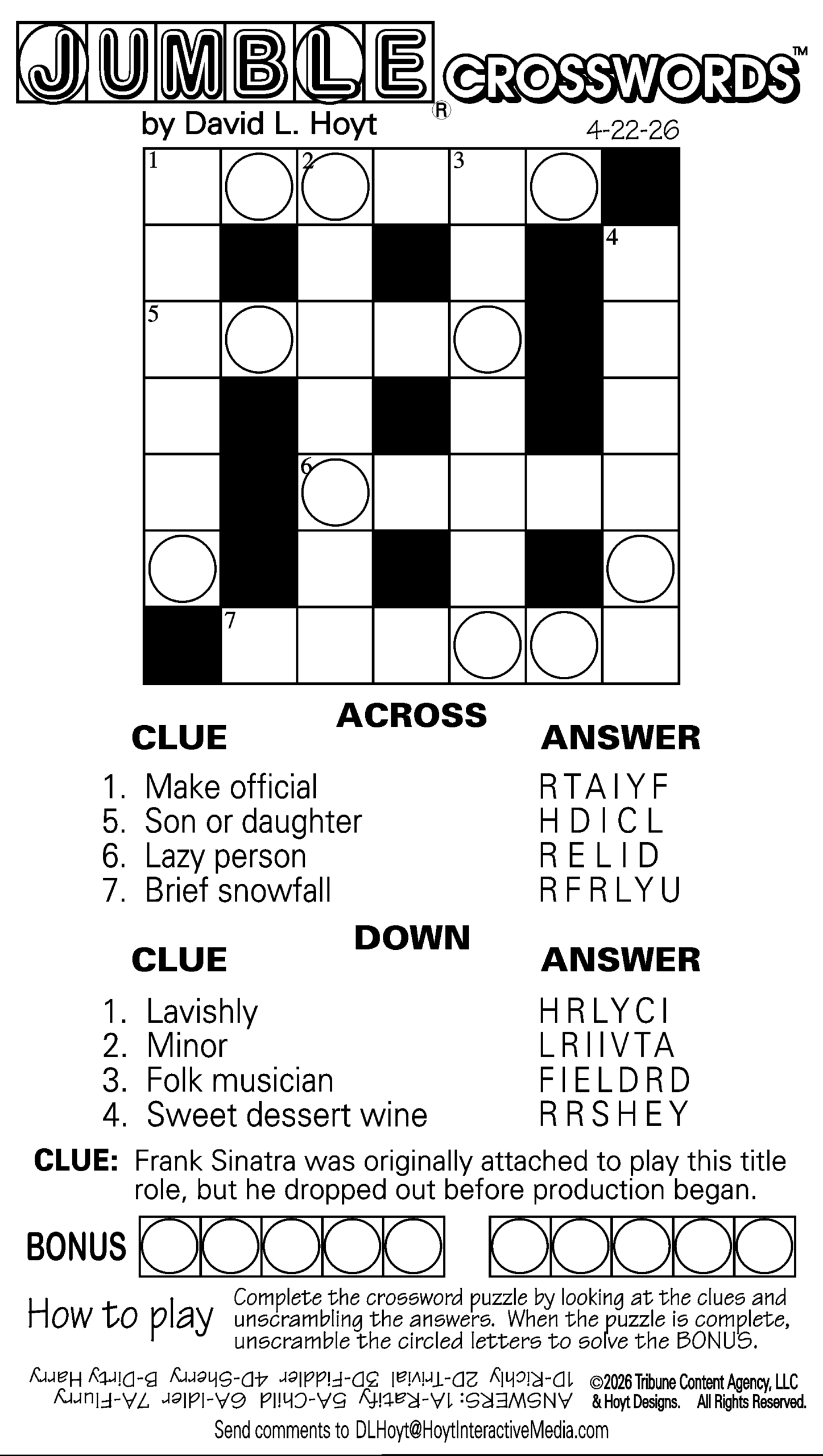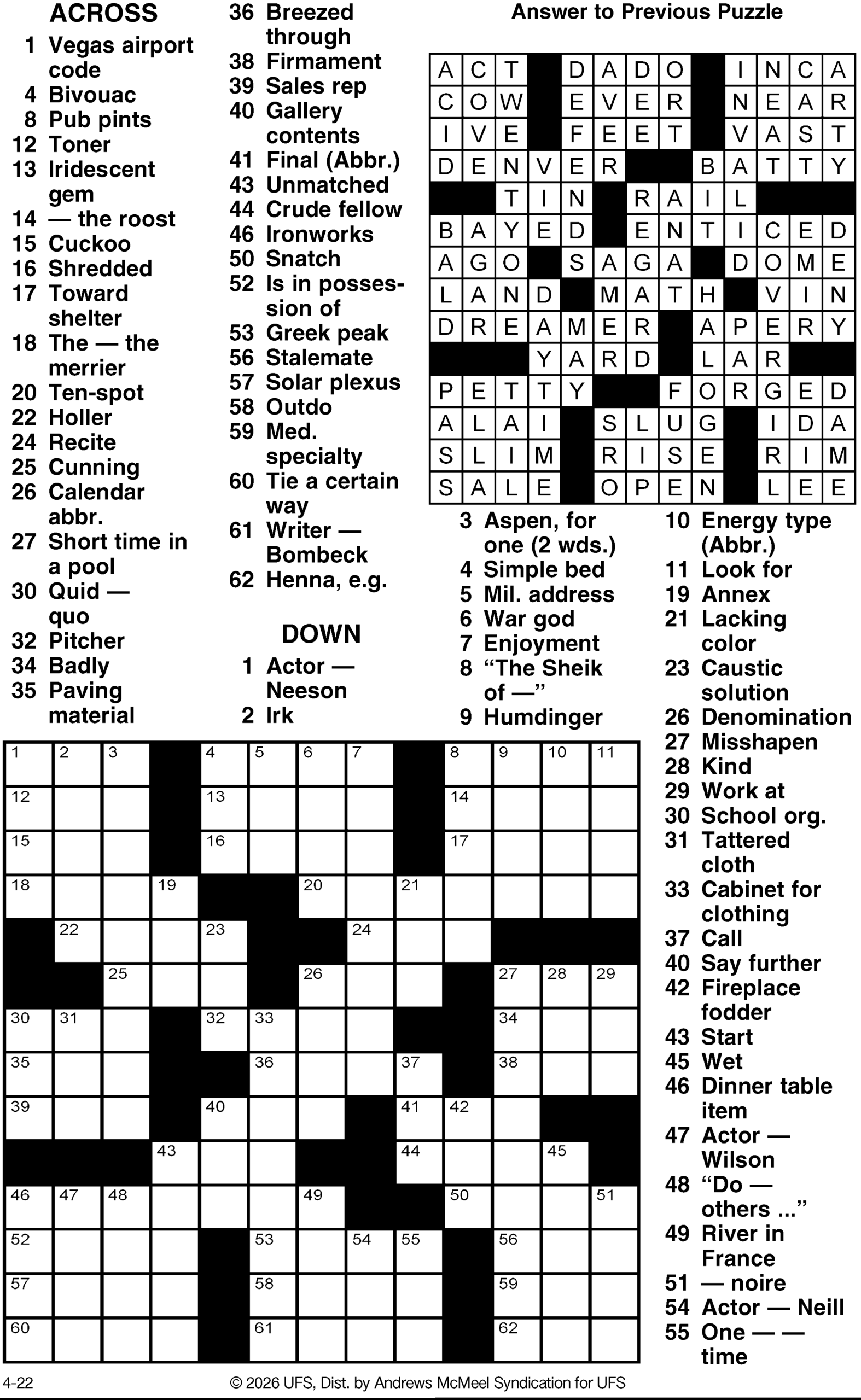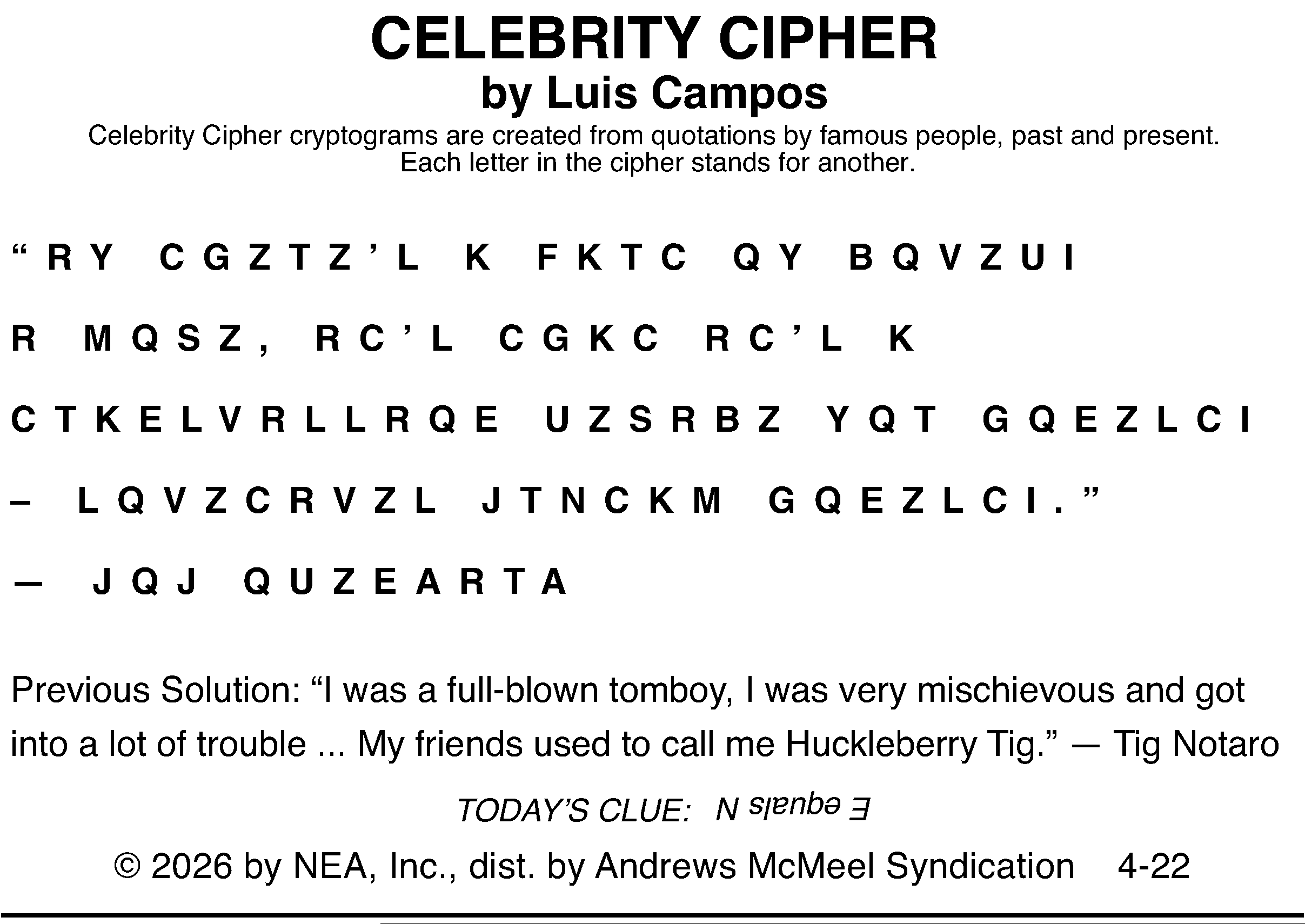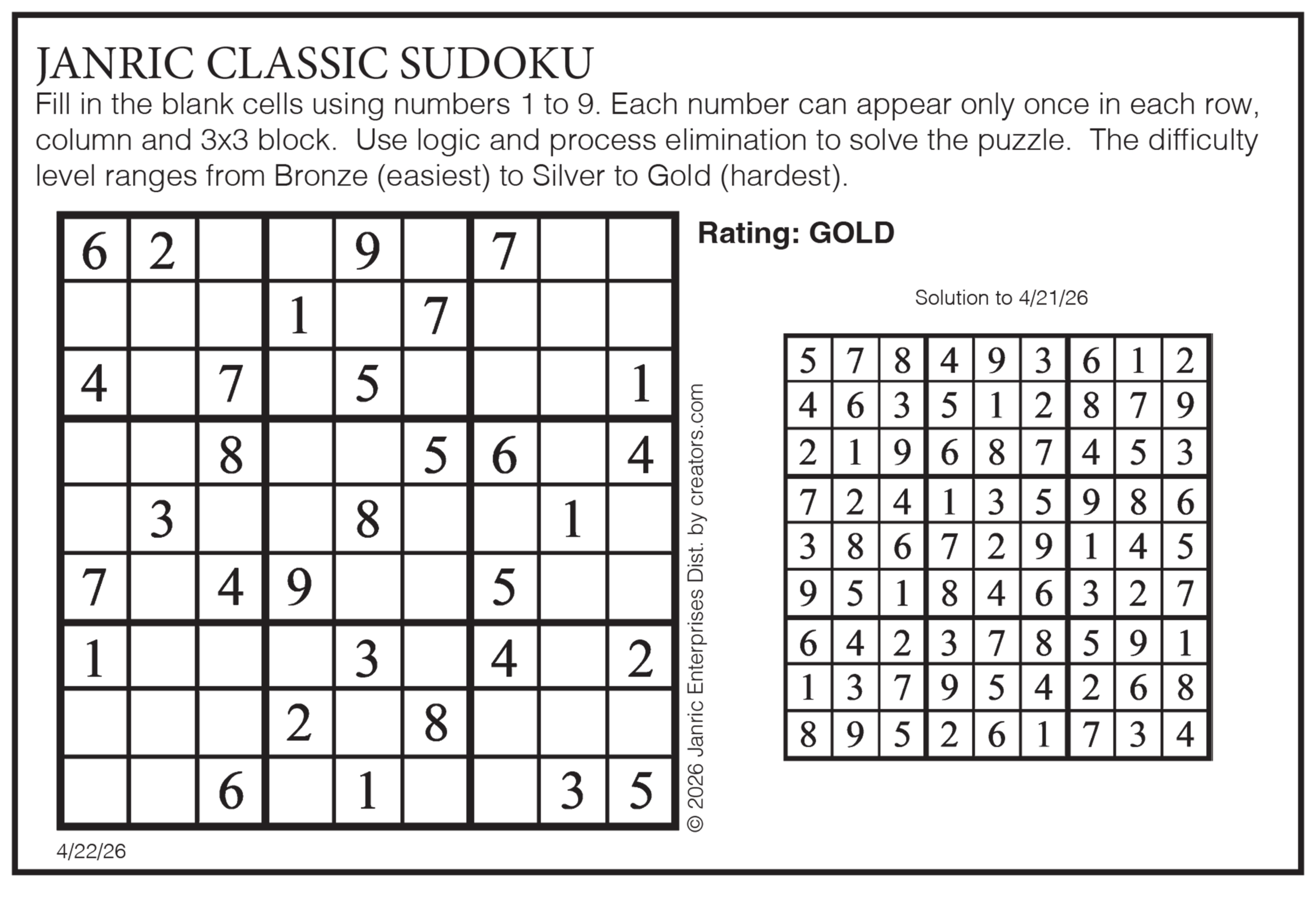 Today’s puzzles: April 22, 2026 Click the corresponding link below to see and print your favorite puzzles Metro Andrews McMeel Crossword Find the words Celebrity Cipher Sudoku Jumble Jumble Crossword Hocus Focus NewsletterToday's breaking news and more in your inboxEmail(Required) I'm interested in (please check all that apply)(Required) Daily Newsletter Breaking News Obituaries Are you a paying subscriber to the newspaper?(Required) Yes No Area Life Today’s puzzles: April 22, 2026 Power up Today’s puzzles: April 21, 2026 Going Up? Stair climbing a challenge on all levels Horoscope: Tuesday, April 21 Your influence is one of steadiness and safety — no flashy fireworks necessary — you still change everything ... Lionel Liberty