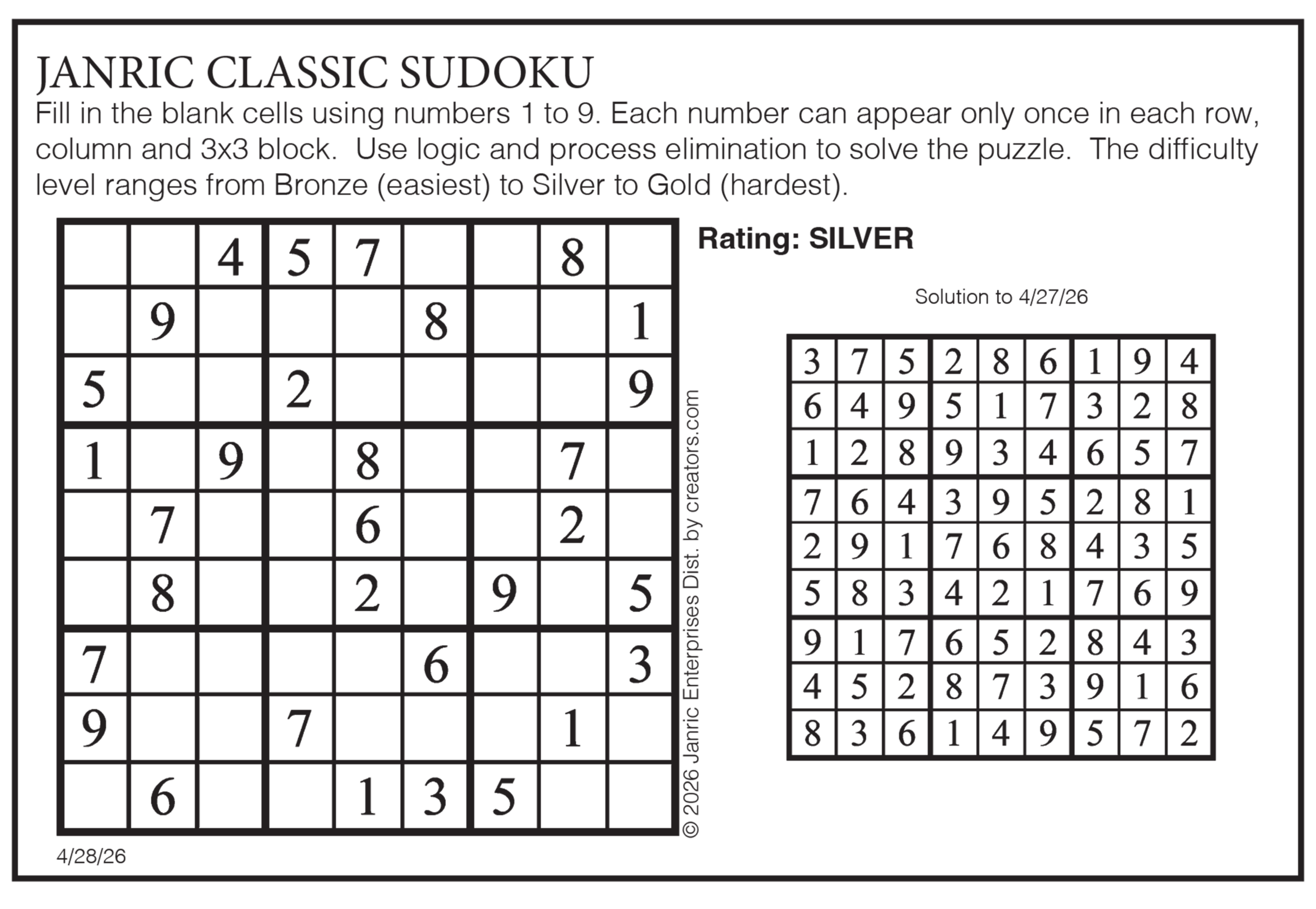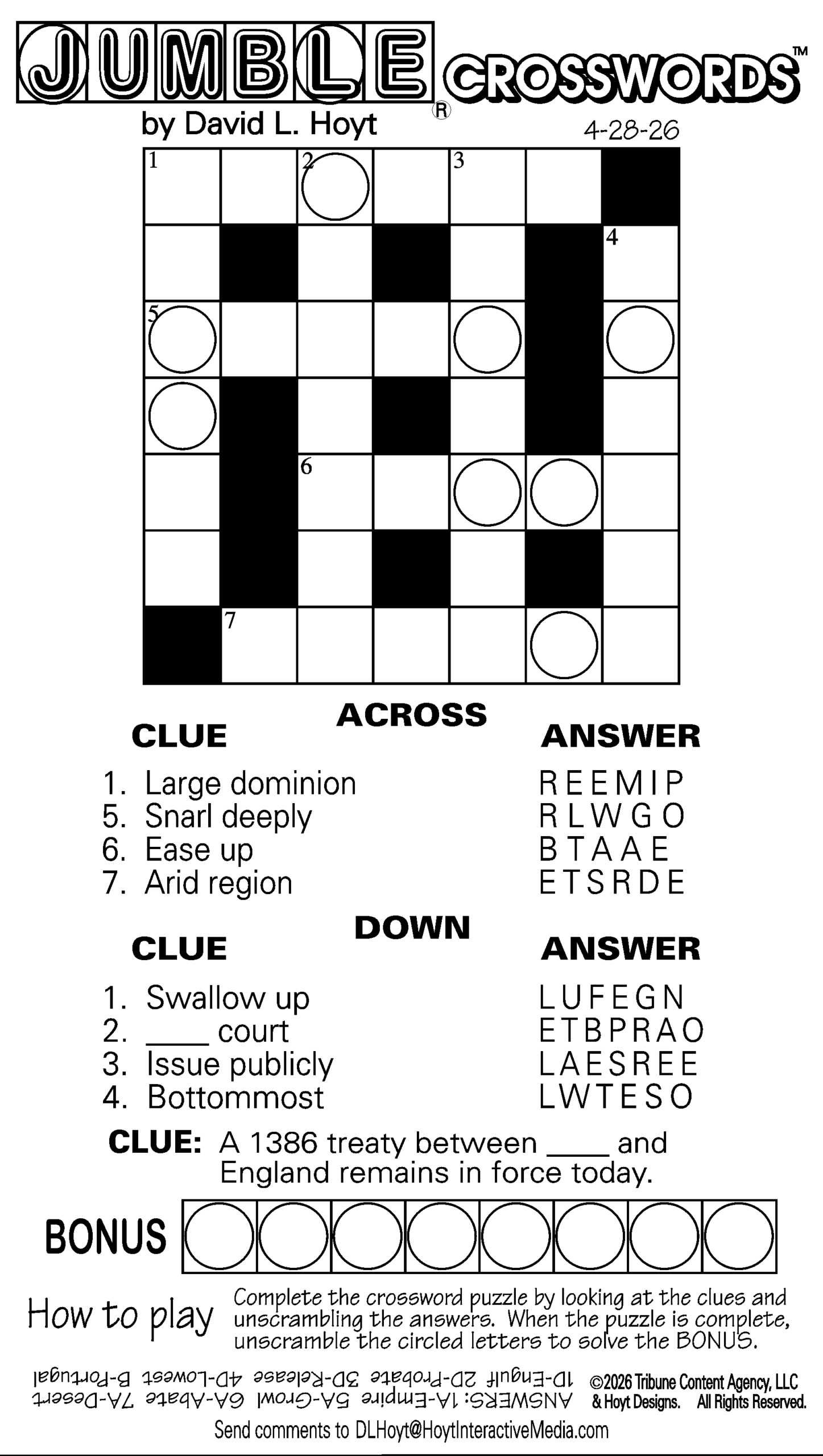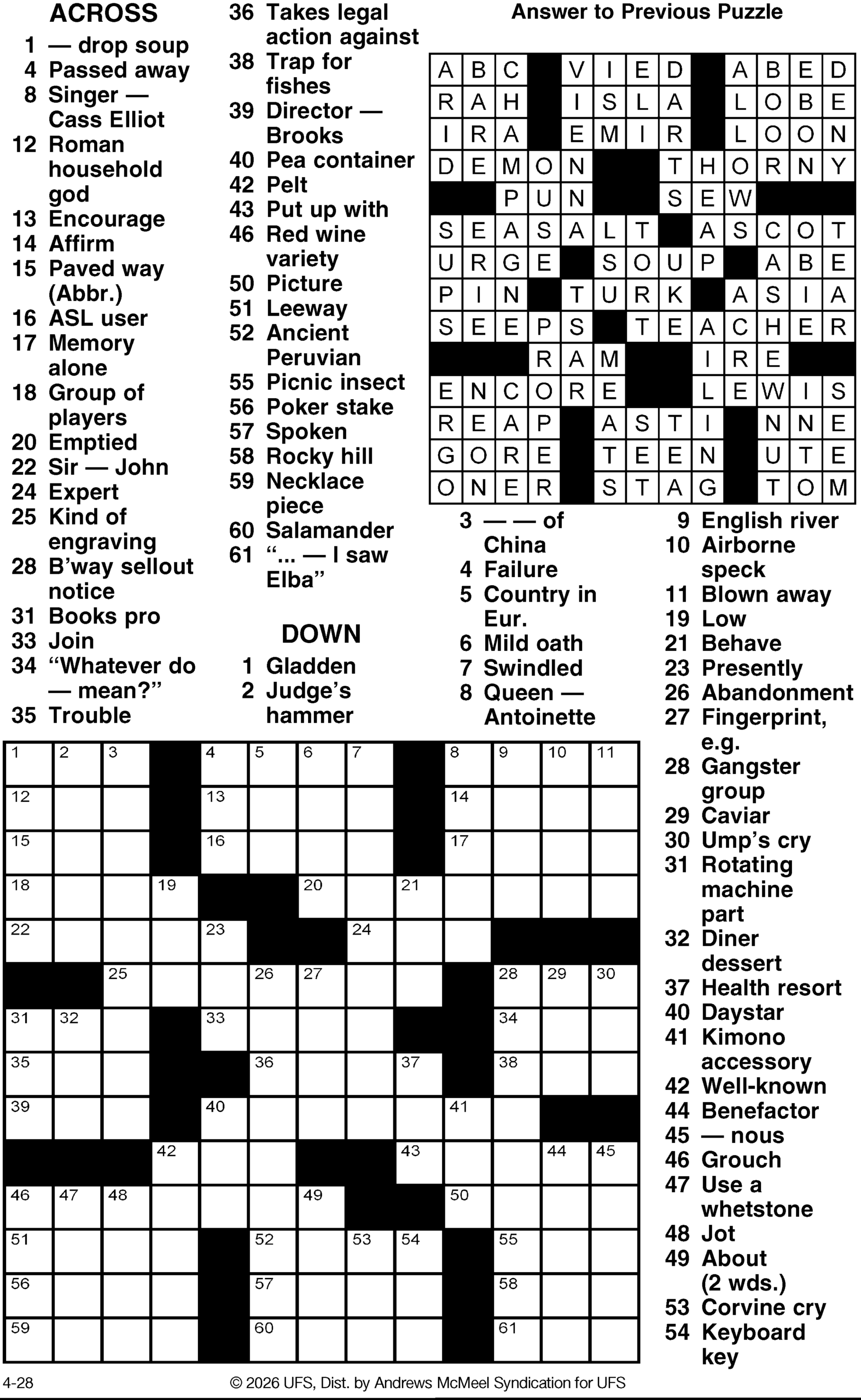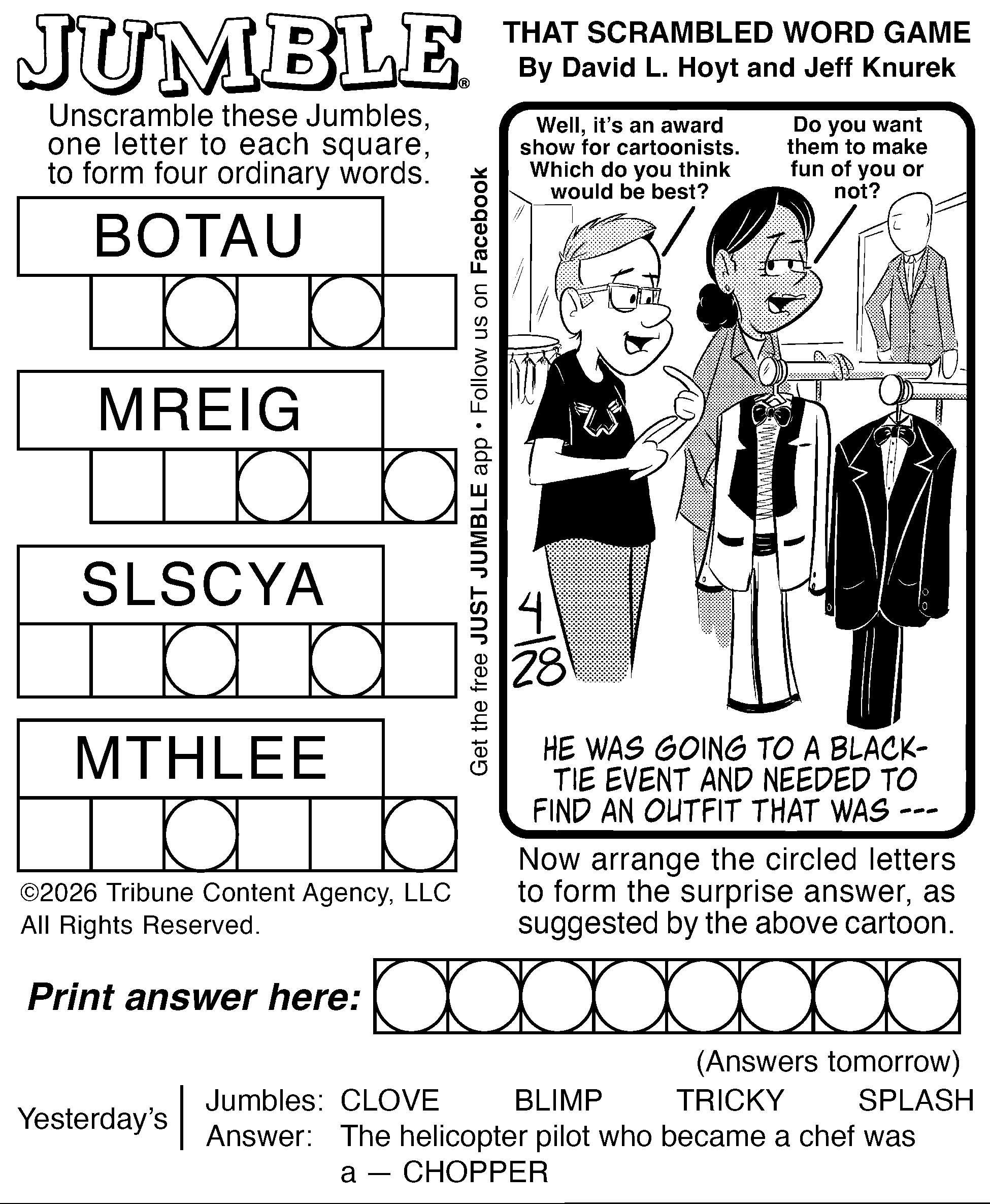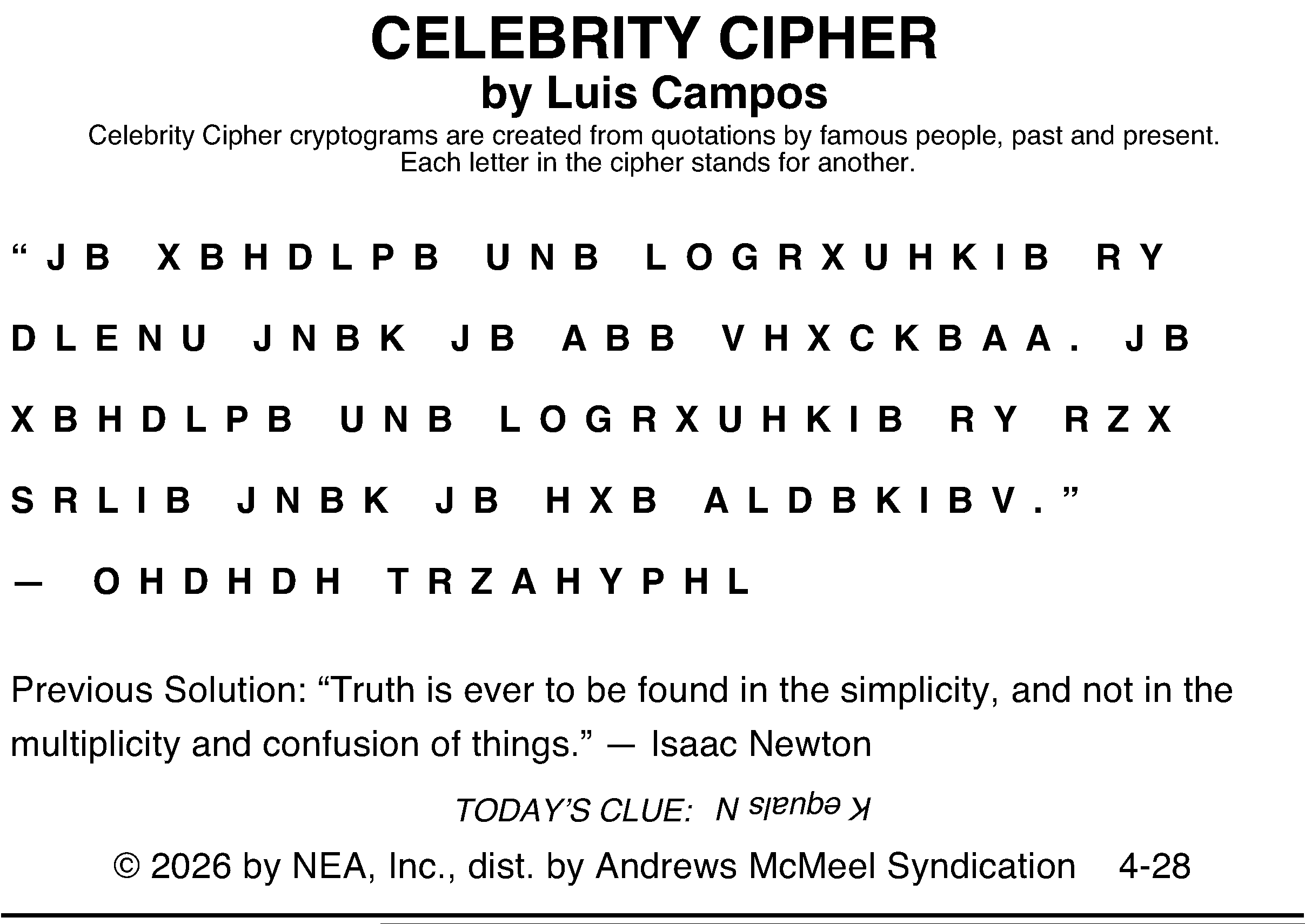 Today’s puzzles: April 28, 2026 Click the corresponding link below to see and print your favorite puzzles Metro Andrews McMeel Crossword Find the words Celebrity Cipher Sudoku Jumble Jumble Crossword Hocus Focus NewsletterToday's breaking news and more in your inboxEmail(Required) I'm interested in (please check all that apply)(Required) Daily Newsletter Breaking News Obituaries Are you a paying subscriber to the newspaper?(Required) Yes No Area Life Today’s puzzles: April 28, 2026 Raising the roof Today’s puzzles: April 27, 2026 Ringing out the old Horoscope — Sunday, April 26 You want a little (money, opportunity, love) and you get a lot. Unearned? No way –– it’s a long time ... This weekend’s puzzles: April 25-26, 2026