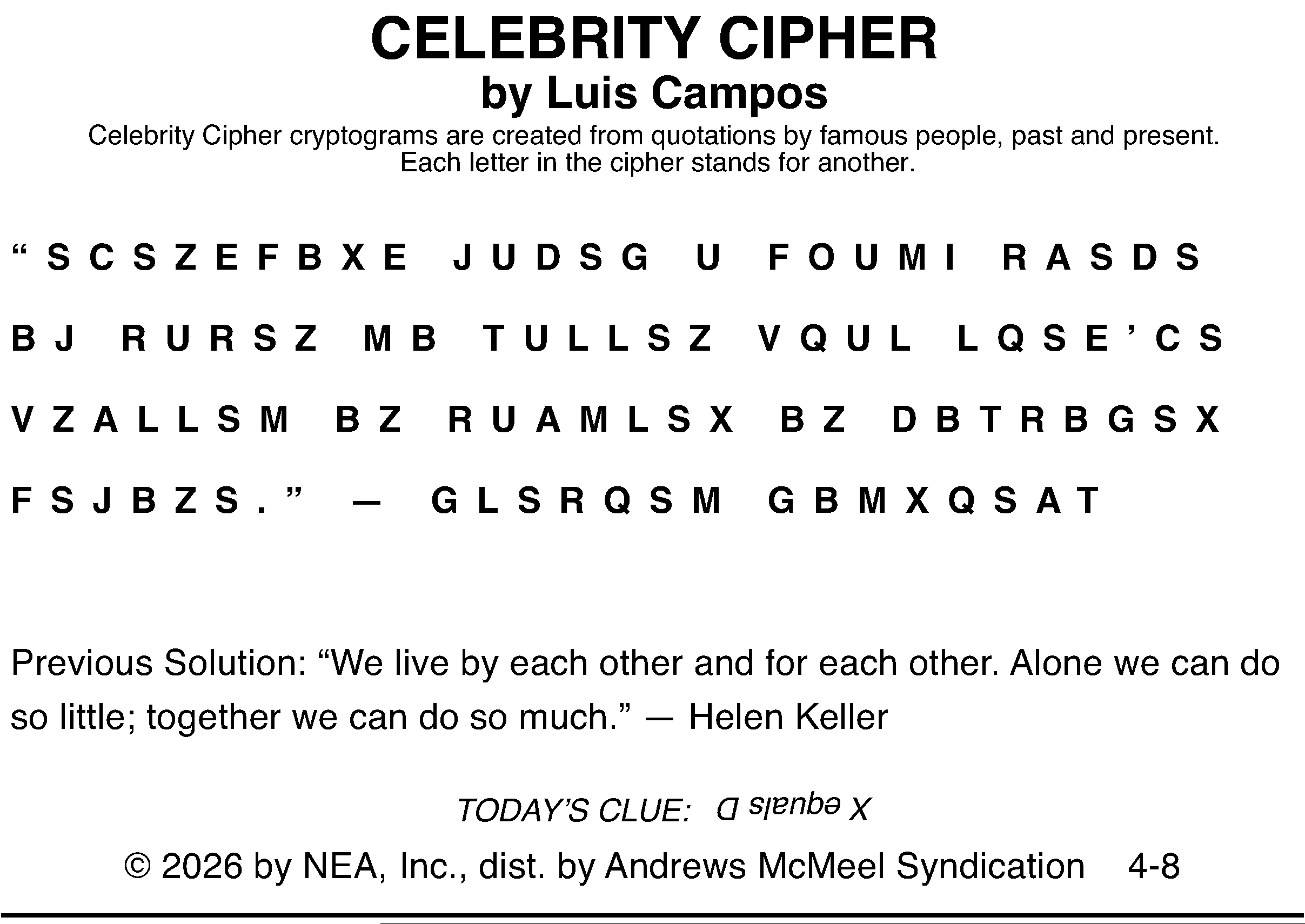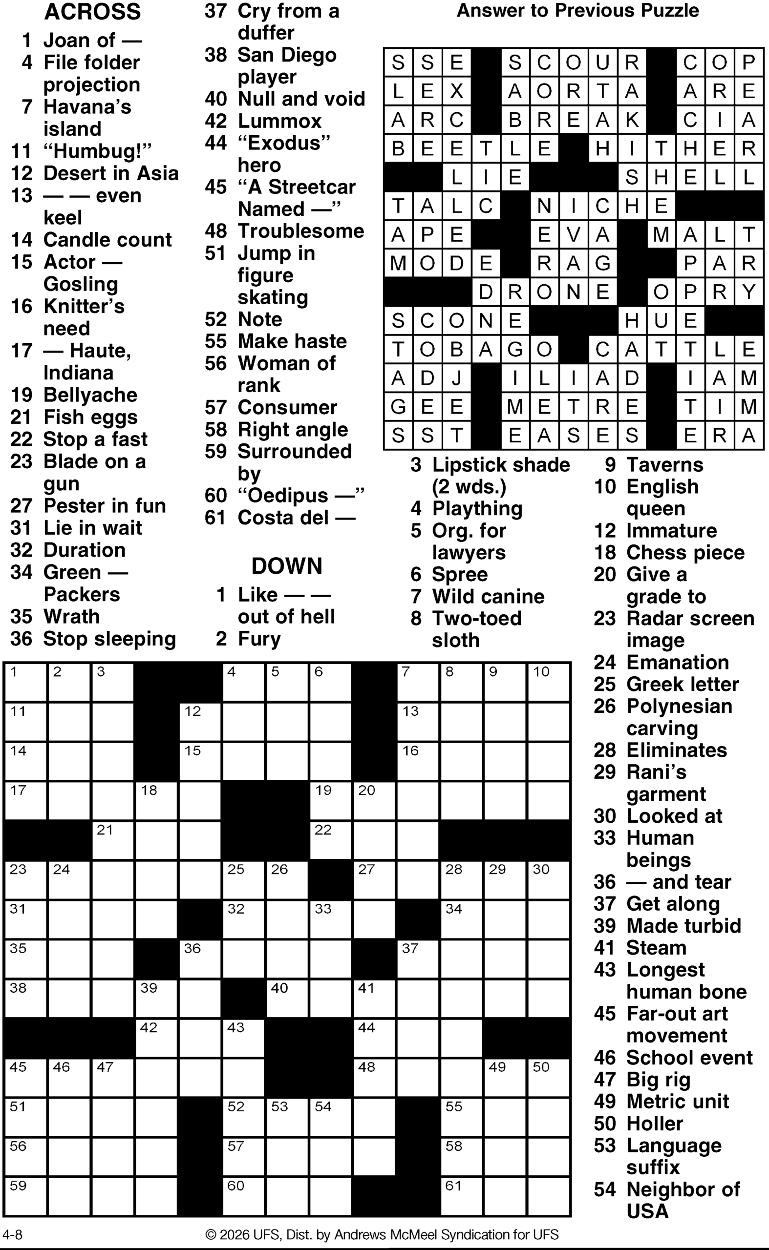 Today’s puzzles: April 6, 2026 Andrews McMeel Crossword https://www.altoonamirror.com/wp-content/uploads/2026/04/nealmon-scaled.png Find the ...