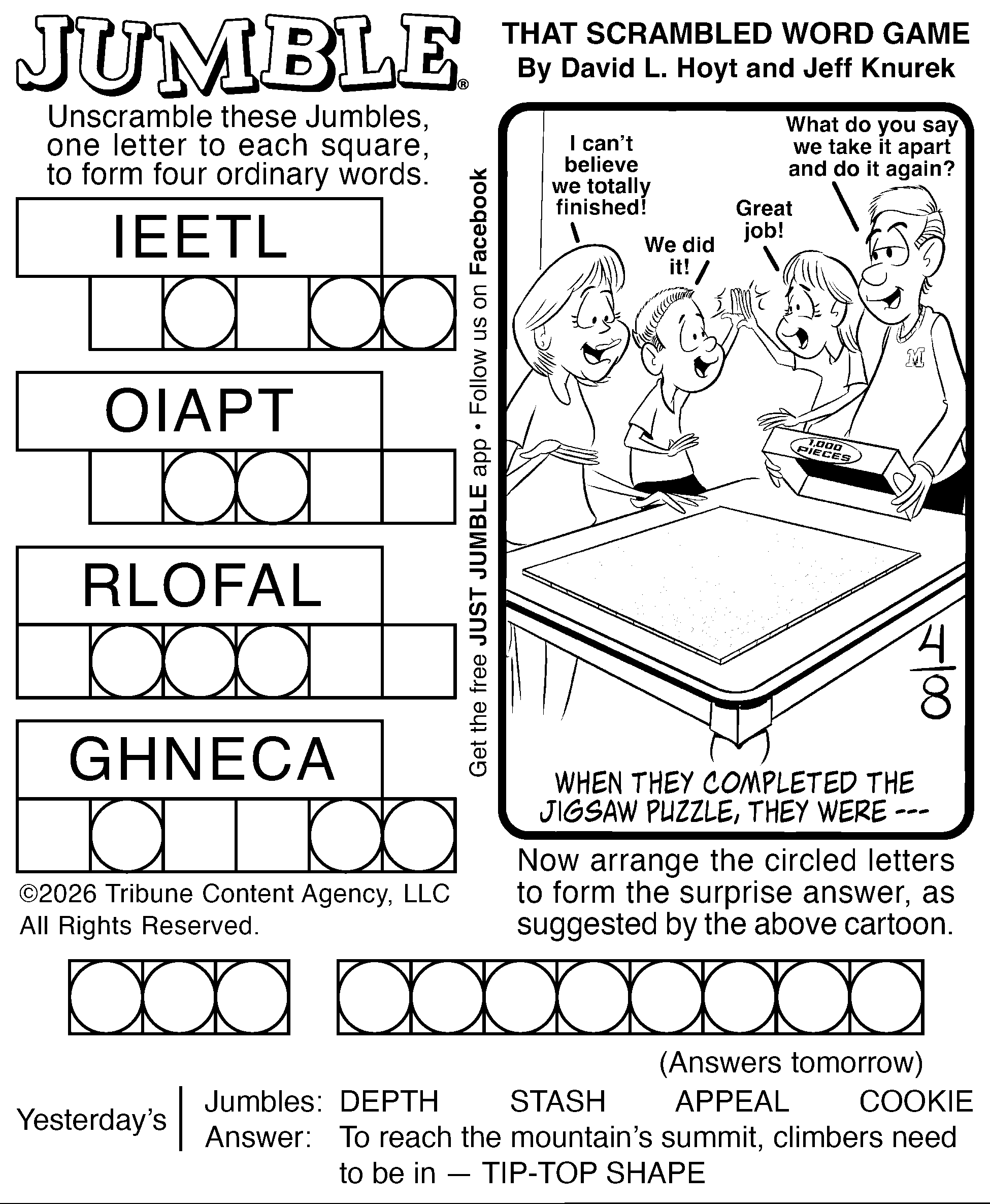 Today’s puzzles: April 8, 2026 Metro Andrews McMeel Crossword Find the words Celebrity Cipher Sudoku Jumble Jumble Crossword Hocus Focus NewsletterToday's breaking news and more in your inboxEmail(Required) I'm interested in (please check all that apply)(Required) Daily Newsletter Breaking News Obituaries Are you a paying subscriber to the newspaper?(Required) Yes No Area Life Today’s puzzles: April 8, 2026 Pave the way Today’s puzzles: April 7, 2026 Andrews McMeel Crossword https://www.altoonamirror.com/wp-content/uploads/2026/04/neal260407-scaled.png Find the ... Here’s lookin’ at you Today’s puzzles: April 6, 2026 Andrews McMeel Crossword https://www.altoonamirror.com/wp-content/uploads/2026/04/nealmon-scaled.png Find the ... Fresh coat