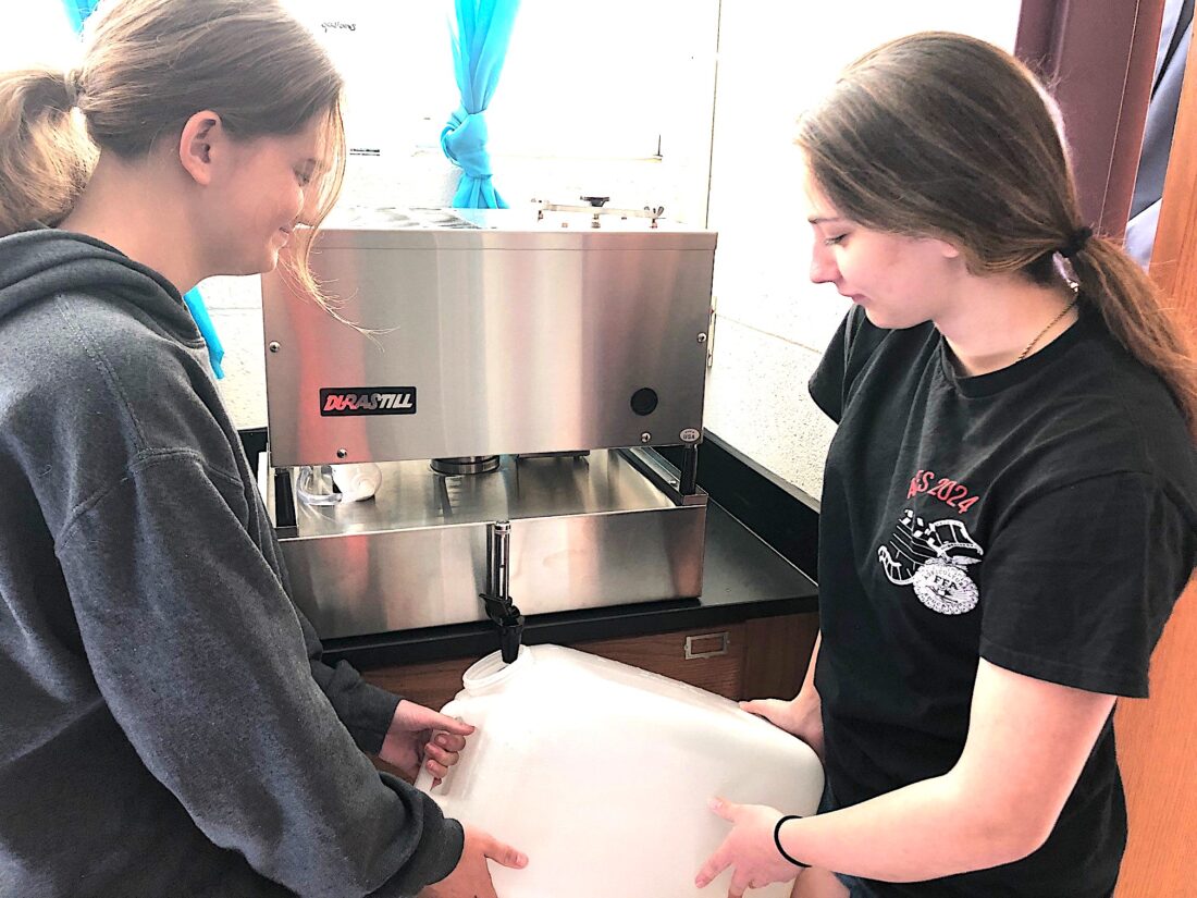 Courtesy photos Madisen Jones (left) and Sarah Weakland assist in filling storage containers as the distiller automatically fills the reservoir, aiding in supplying distilled water to school science labs and the agriculture program at Tyrone Area High School. The distiller and a portable steam autoclave were purchased through funds from Grants for Growing.