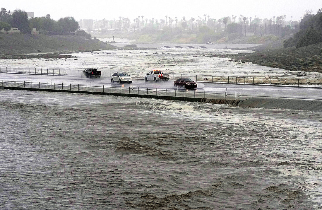 Vehicles cross over a flood control basin that has almost reached the street on Sunday in Palm Desert, Calif. Forecasters said Tropical Storm Hilary was the first tropical storm to hit Southern California in 84 years, bringing the potential for flash floods, mudslides, isolated tornadoes, high winds and power outages. The Associated Press