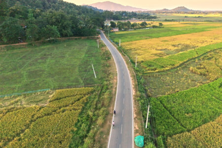 Cars pass a dual-language sign for the Menominee Indian Tribe of Wisconsin, which was erected along Highway 47/55 in Keshena, Wisconsin, on Nov. 17, 2022. Wisconsin Department of Transportation via AP