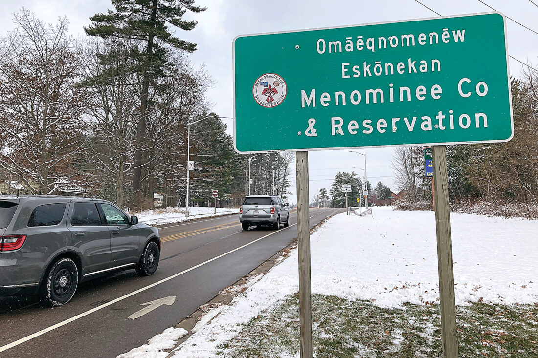 Cars pass a dual-language sign for the Menominee Indian Tribe of Wisconsin, which was erected along Highway 47/55 in Keshena, Wisconsin, on Nov. 17, 2022. Wisconsin Department of Transportation via AP