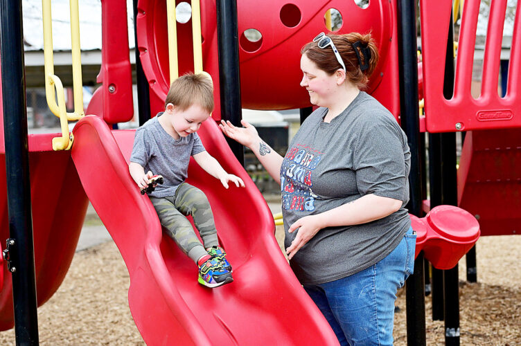 Taylor Ott watches her son, Lucas Ott, 2, both of Altoona, go down the slide at Jefferson Park on Tuesday afternoon. Mirror photo by Patrick Waksmunski