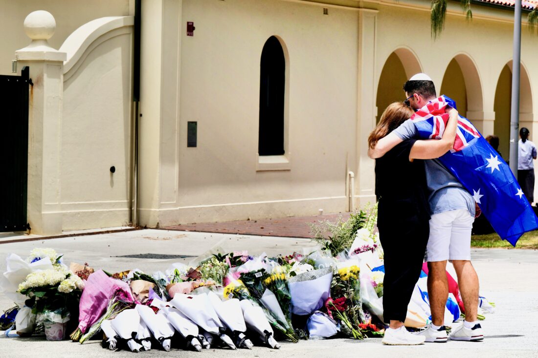 The Associated Press / A couple lay flowers at a tribute to shooting victims outside the Bondi Pavilion at Sydney’s Bondi Beach Monday, a day after the shooting.