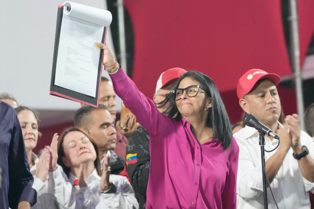 Venezuela’s acting President Delcy Rodriguez takes part in a rally on Thursday holding up a copy of a new law after lawmakers approved legislation opening the nation’s oil sector to privatization, at the Miraflores Palace in Caracas, Venezuela. The Associated Press