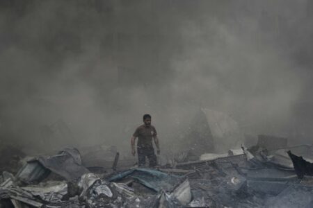 A first responder emerges through the smoke at the site of an Israeli airstrike that struck an apartment building in Beirut, Lebanon, Wednesday, April 8, 2026. (AP Photo/Bilal Hussein)