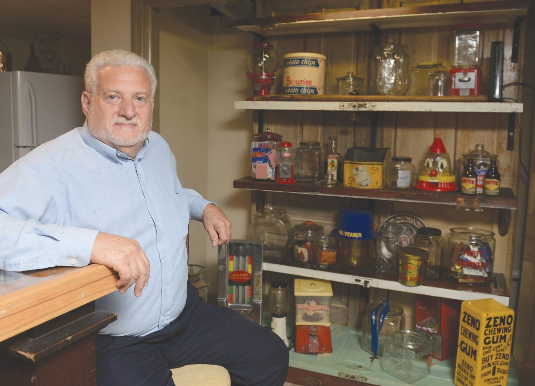 Mirror photo by Gary M. Baranec / Dave Binus shows off part of his collection of candy machines that his company supplied to customers of Altoona Candy and Tobacco. Altoona Candy and Tobacco will be inducted into the Heritage Hall of Fame category by the Blair County Chamber of Commerce Business Hall of Fame on Monday at the Blair County Convention Center.