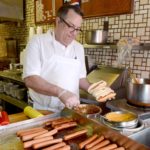 Mirror photo by Gary M. Baranec Bob Lamont serves up hot dogs at Texas Hot Dogs, a task he has been doing since 1971. To commemorate Texas Hot Dogs’ 100th year in business, Lamont said some special activities will be held throughout the year.