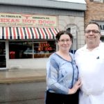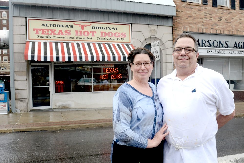 Mirror photo by Gary M. Baranec Bob Lamont and his wife, Cindy, pose in front of Texas Hot Dogs in downtown Altoona. At ages 62 and 61 respectively, neither Bob nor Cindy have any immediate plans to retire.
