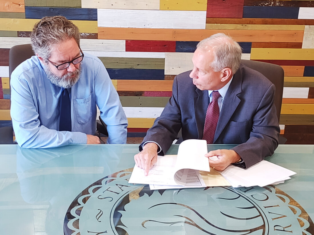 Mirror photo by Walt Frank / Complete Insurance Services office manager Vince Burr (left) chats with owner/founder John H. Eichelberger Jr.