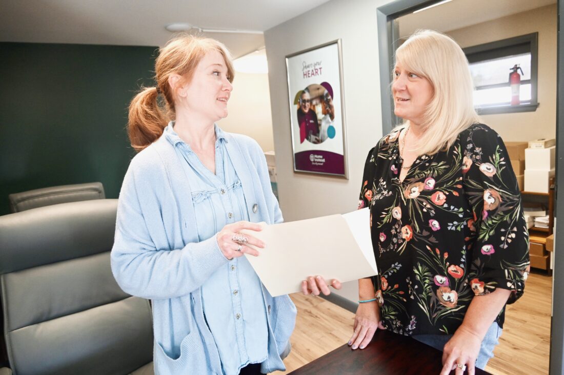 Mirror photo by Patrick Waksmunski / Home Instead general manager Tiffany Rice (left) talks with owner Mindy Sheehan at the Duncansville office.