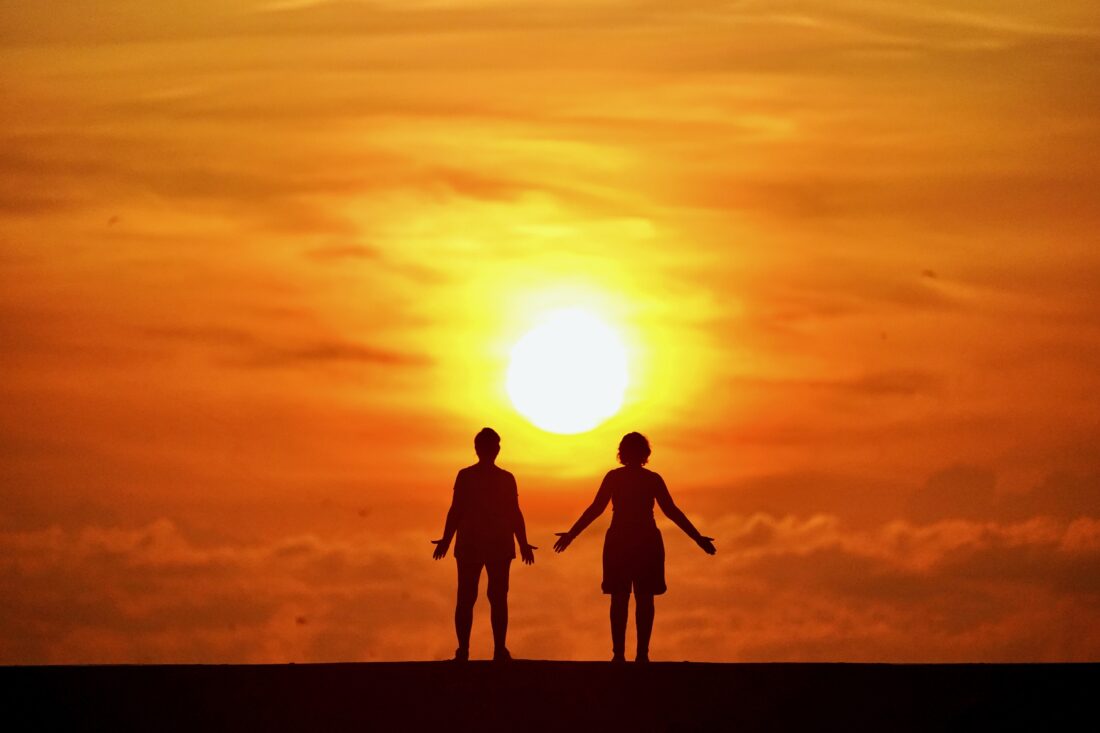 FILE - A couple stands on a jetty as the sun rises over the Atlantic Ocean in Bal Harbour, Fla., Sept. 19, 2020. (AP Photo/Wilfredo Lee, File)