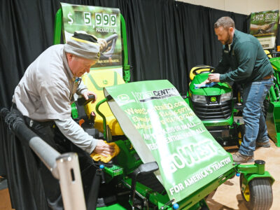 Driver Doug Crile (left) and store manager Luke Mock of West Central Equipment, Martinsburg, set up their company’s display at Blair County Convention Center for last year’s Blair County Home Garden & Healthy Living Showcase. Mirror file photo