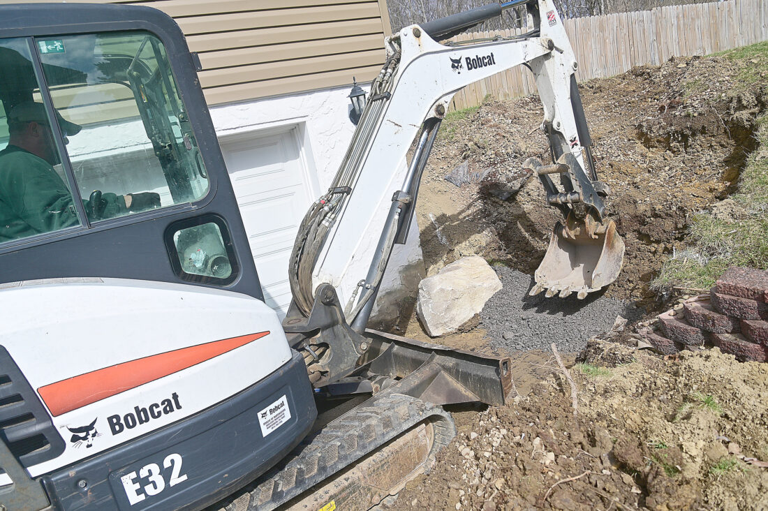 ProLawn Landscaping and Maintenance Co. owner Rich Huber preps for the laying of a block step. Mirror photo by Patrick Waksmunski