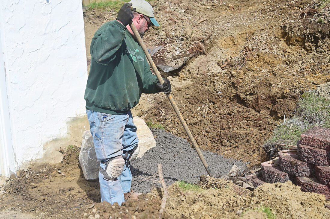 - ProLawn Landscaping and Maintenance Co. owner Rich Huber preps for the laying of a block step. Mirror photo by Patrick Waksmunski