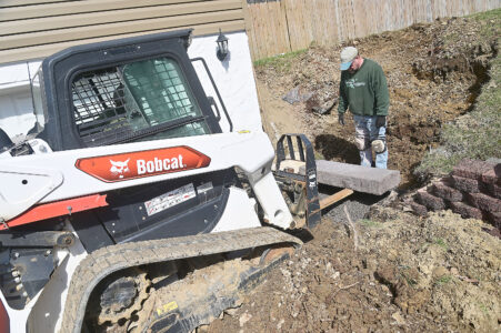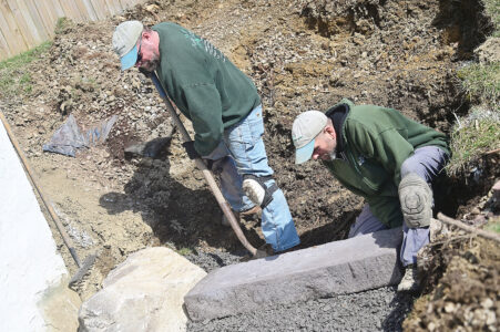 ProLawn Landscaping and Maintenance company foreman Dave Sipes places stone for the laying of a block step. Mirror photo by Patrick Waksmunski